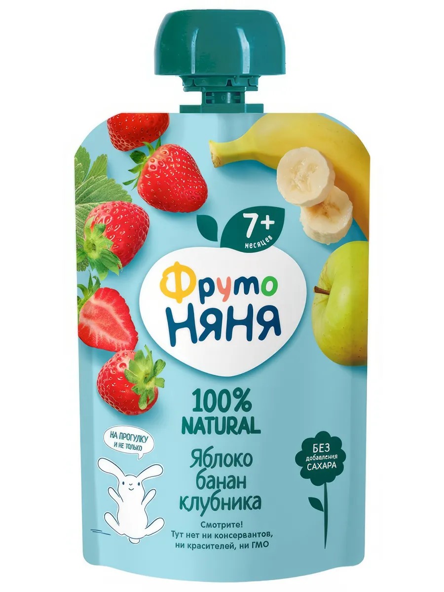 FrutoNyanya Apple-Banana-Strawberry dessert, 90g, designed for babies aged 7 months and older, consists exclusively of natural fruit puree. Thanks to its high content of pectin, organic acids, and fiber, this product normalizes the baby's gastrointestinal tract, while its abundance of vitamins and minerals helps your baby grow healthy and strong.