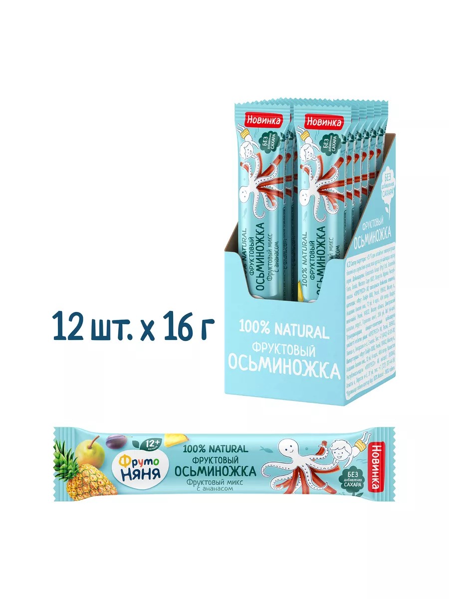 Фруктовый осьминожка фруктовый микс с ананасом от ФрутоНяня — это вкусное и полезное лакомство для малышей старше 12 месяцев. В составе натуральные соки и пюре фруктов и ягод без добавления сахара. Увлекательная форма фруктового осьминожки разработана специально для маленьких пальчиков и способствует развитию мелкой моторики. Лакомство удобно положить в детский рюкзачок и взять с собой на прогулку благодаря удобной упаковке. Фруктовые кусочки Фрутоняня. Без добавления сахара. Содержит сахара природного происхождения.