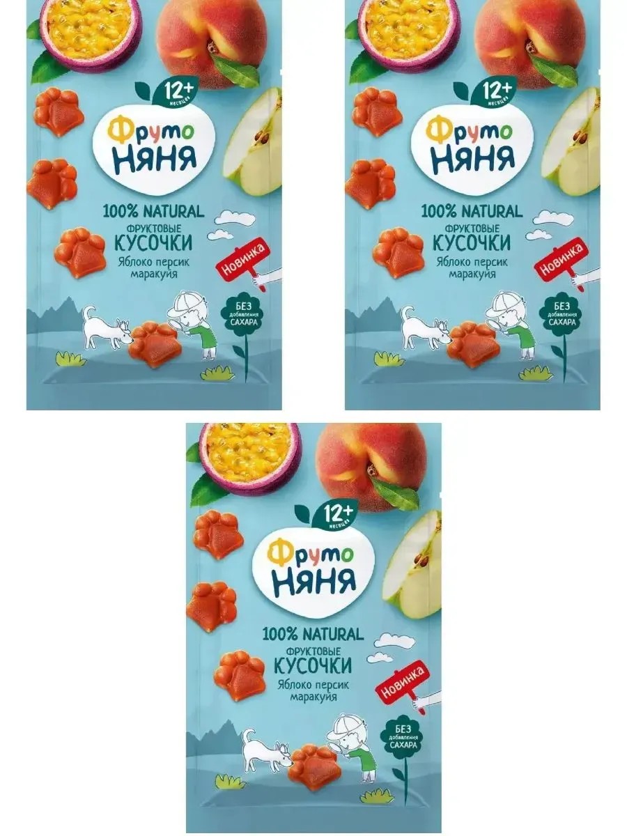Фруктовые кусочки ФрутоНяня с яблоком, персиком и маракуйей в забавной форме лапки.