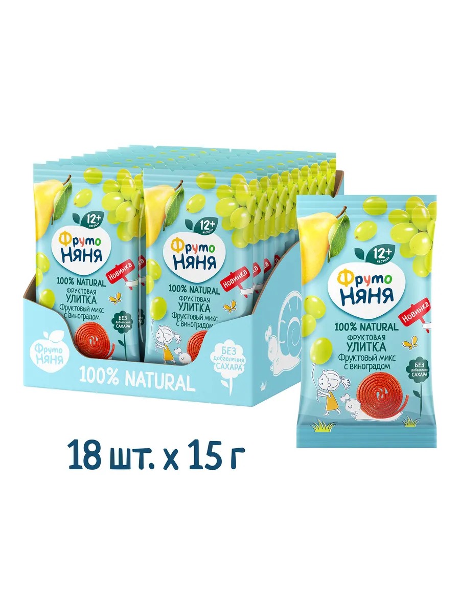 Фруктовая улитка ФрутоНяня — это вкусное и полезное лакомство для малышей старше 12 месяцев. Фруктовый микс со ярким и свежим виноградом порадует вашего маленького гурмана. В составе только натуральные соки и пюре фруктов и ягод без добавления сахара. Забавная форма не даст малышам заскучать и способствует развитию мелкой моторики, а коллекционная карточка внутри упаковки познакомит с окружающим миром.