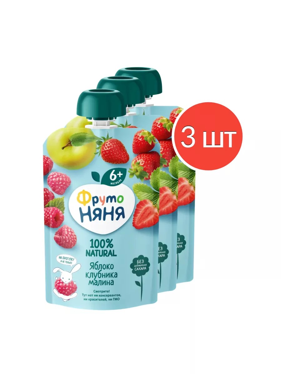 FrutoNyanya fruit puree made with apples, strawberries, and raspberries in a soft pack is a delicious and healthy snack that's easy to take on the go. The bright, soft packaging will attract your little one's attention and encourage them to eat independently. Fragrant raspberries, juicy strawberries, and ripe apples will provide your baby with natural benefits and energy for harmonious growth!