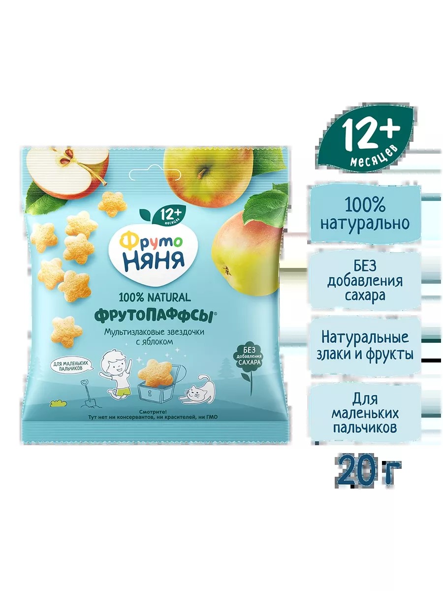 Новинка от ФрутоНяня - воздушные ФрутоПаффсы! Это легкий перекус для вашего малыша, в составе которого нет ничего лишнего: сладкий вкус придают фрукты, энергией насыщают злаки. Форма звездочки удобна для маленьких пальчиков и помогает развивать мелкую моторику ребенка. С ФрутоПаффсами сытно и весело в любой ситуации!