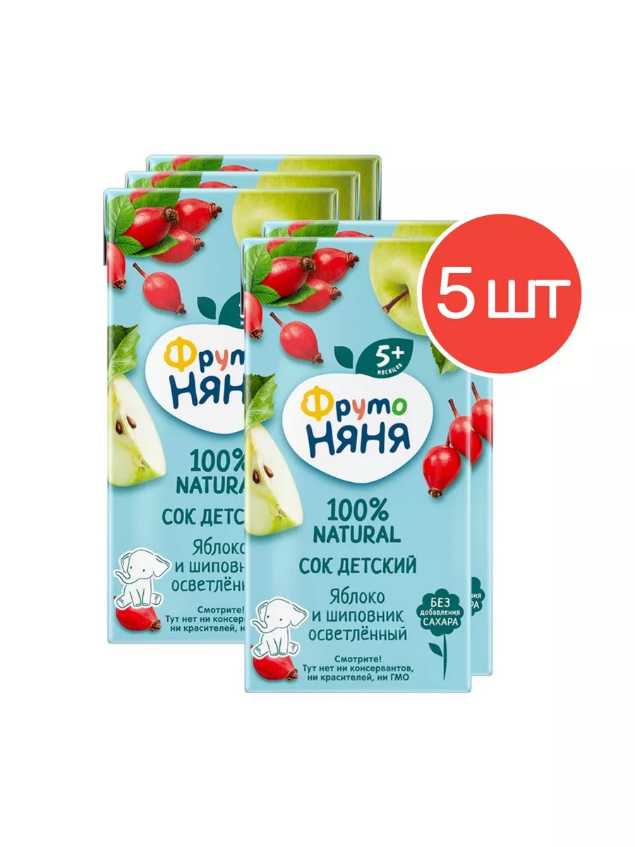 Сок из яблок и шиповника «ФрутоНяня» – это уникальное сочетание вкуса сочного наливного яблока и ароматного шиповника. В составе 100% натуральные фруктовые соки без добавления сахара. Сок «ФрутоНяня» из яблок и шиповника станет отличным дополнением рациона детей от 5 месяцев. Формат упаковки 200 мл удобно брать с собой на прогулку или в гости, чтобы малыш в любом месте мог зарядиться энергией и пользой.