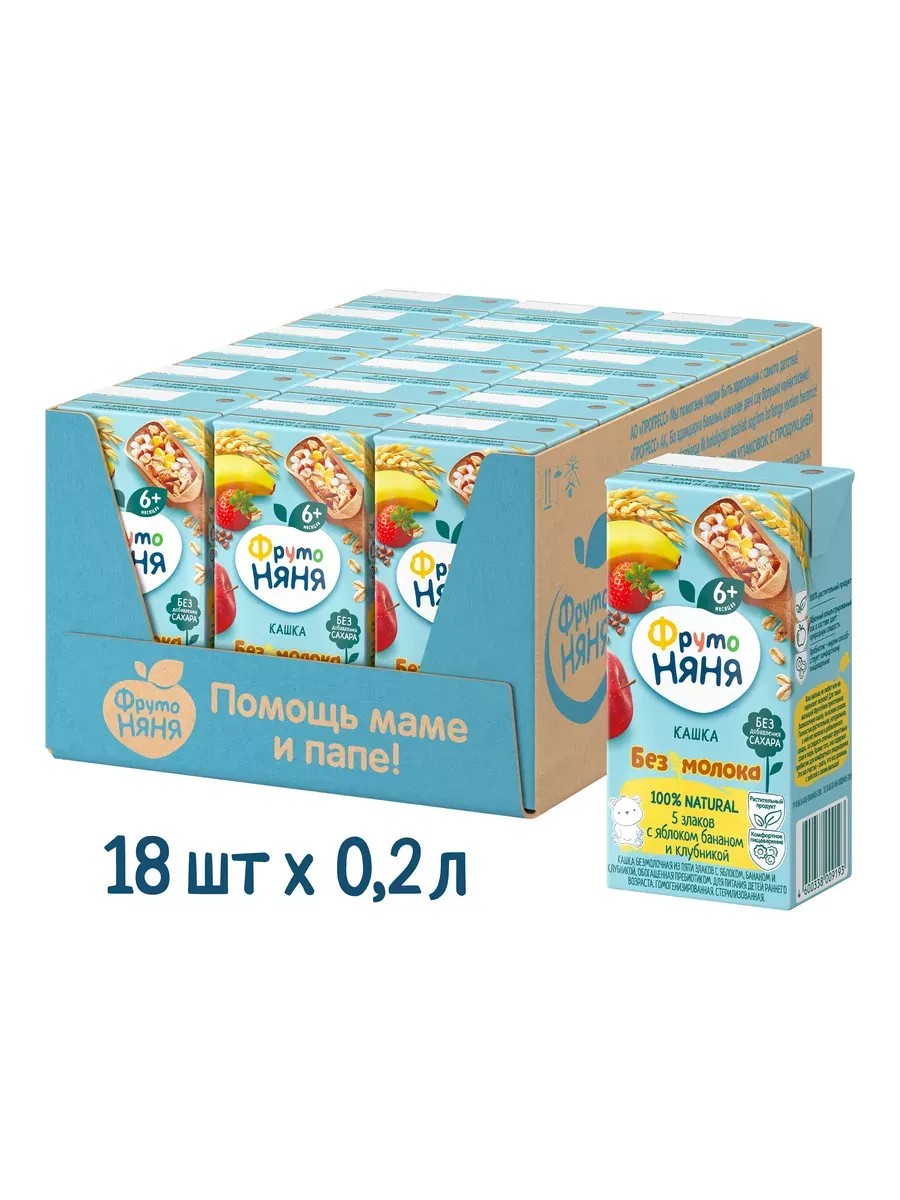 Безмолочная фруктово-злаковая каша «ФрутоНяня» с яблоком, бананом, клубникой и злаками создана специально для малышей, которые не переносят молоко. Эта полностью натуральная и растительная каша не содержит молока и добавленного сахара, а сладость ей придают фруктовые соки и пюре. Кроме того, в каше есть пребиотики для комфортного пищеварения.