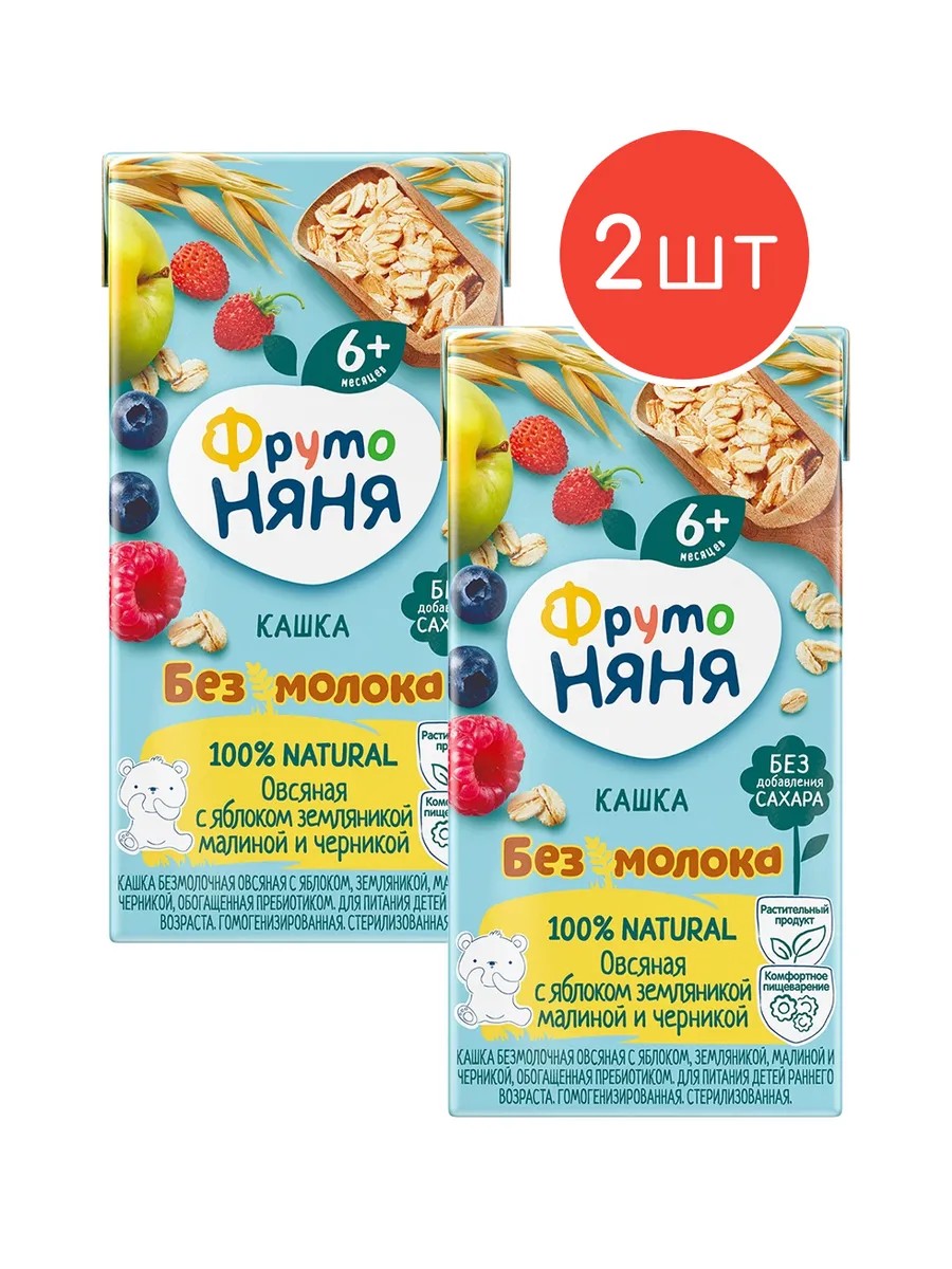 Жидкая безмолочная овсяная каша «ФрутоНяня» с яблоком, земляникой, малиной и черникой — идеальное решение сытного и полезного завтрака для детей с 6 месяцев, которые не переносят лактозу.