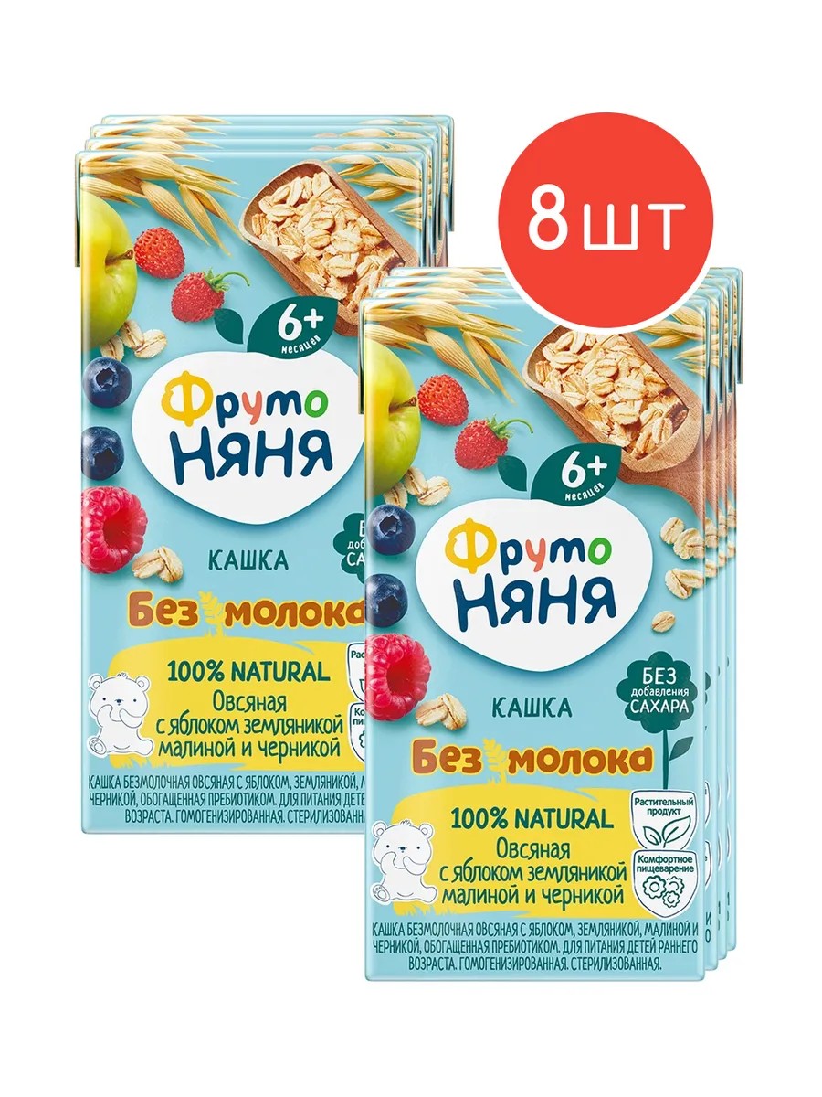 Жидкая безмолочная овсяная каша «ФрутоНяня» с яблоком, земляникой, малиной и черникой — идеальное решение сытного и полезного завтрака для детей с 6 месяцев, которые не переносят лактозу.