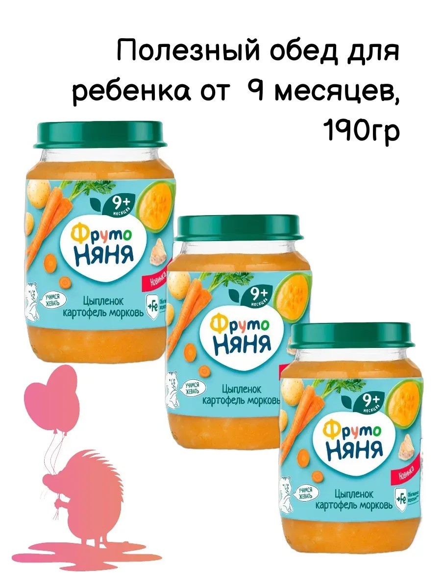 Пюре Фрутоняня цыпленок-картофель-морковь, 190г обладает ярким и насыщенным вкусом, который гармонично дополняется легким ароматом. Это продукт, обладающей высокой питательной и энергетической ценностью. Пюре из мяса и овощей является важным продуктом в рационе питания малыша. В нем содержится белок, являющийся важным строительным материалом для организма человека. Пюре помогает быстро утолить чувство голода ребенка и наполнить его организм энергией. Мясо цыпленка содержит незаменимые жирные кислоты, которые важны для нормальной работы иммунной системы. Кроме того, в мясе есть ряд витаминов и элементов, в частности: кальций, калий и фосфор. Искусственные добавки, консерванты, красители и ГМО в составе не содержатся.