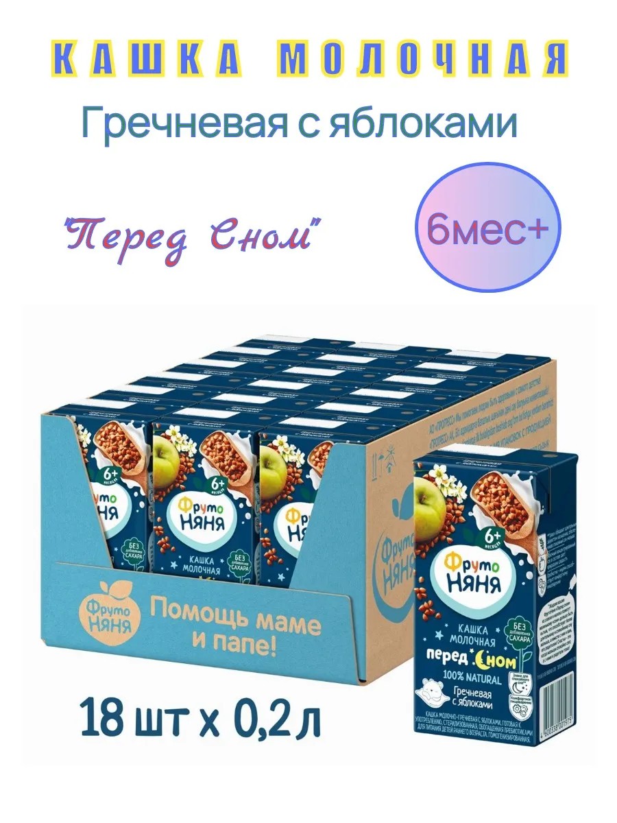 Buckwheat milk porridge with apple, 200 ml, "before bedtime." Ready to eat. Recommended for feeding children aged 6 months and older. A complete portion of food for your baby. It is presented in a tetrapak package, which fully preserves all the nutrients without the use of preservatives. Contains only natural ingredients, without dyes, flavors, or fat substitutes. Additionally, the porridge is enriched with prebiotics, which help improve digestion. Before use, warm the product by pouring it into a bottle or plate and stir thoroughly. Contains natural sugars. A drinking straw is included.