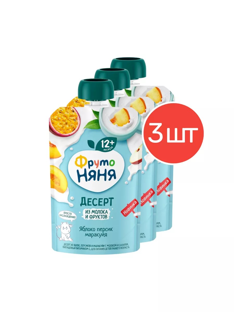 СоставПюре из яблок, сахара, пюре из персиков, молоко сухое цельное, сок маракуйи концентрированный крахм; ал кукурузный, стабилизатор - пектин, загуститель – камедь ксантановая, аскорбиновая кислота – вита; мин С, регулятор кислотности – лимонная кислота, вода питьевая.