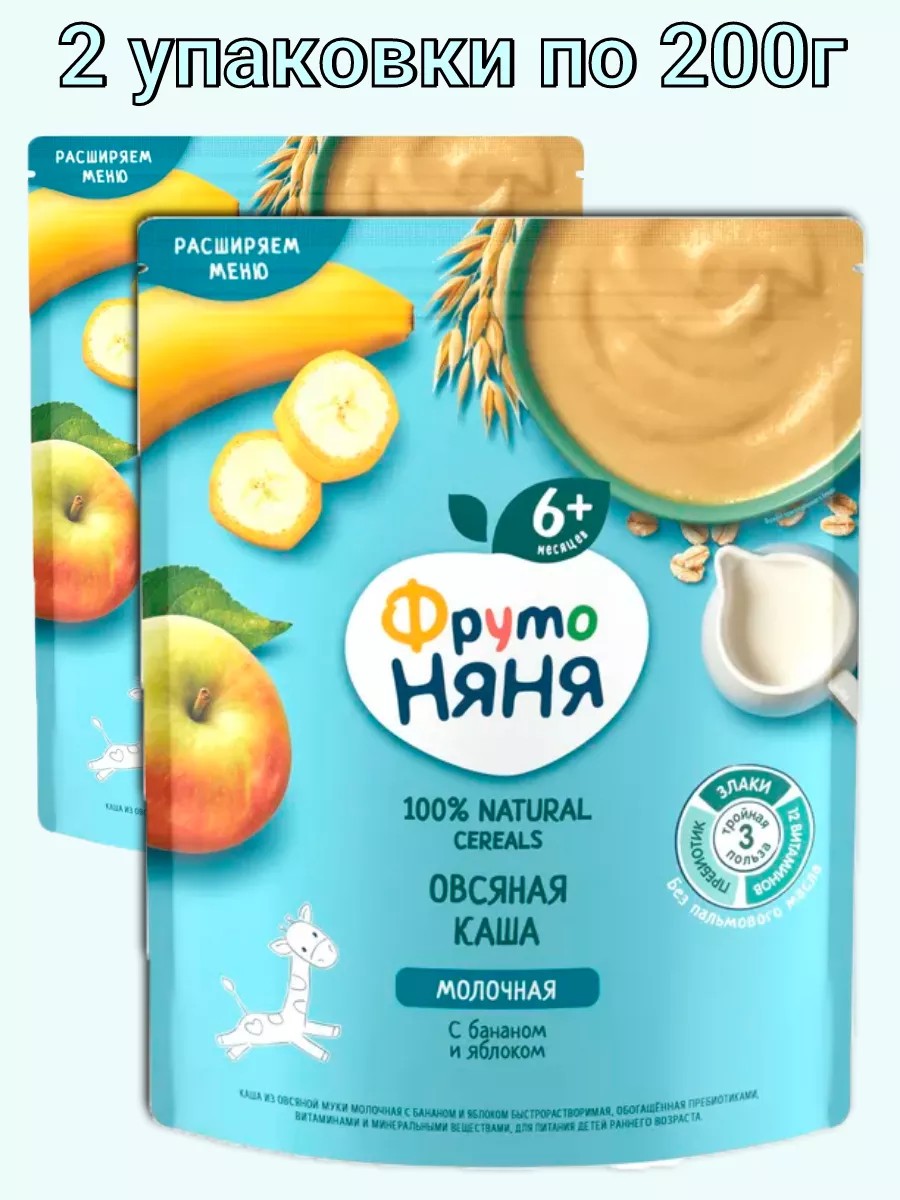 2 packs of 200g. FrutoNyanya milk oatmeal porridge with apples and bananas for children from 6 months. Enriched with vitamins and minerals. Made with natural fruit puree. No preservatives, colorants, or GMOs. Start introducing the porridge gradually, starting with 1 teaspoon of the finished product. The recommended serving size is 1-2 servings of porridge per day. The recommended volume of porridge at 6 months is 150g per day, by 8 months - 180g, by 12 months - 200g. Use only freshly prepared porridge for feeding. Any portion left over after feeding should not be used.
