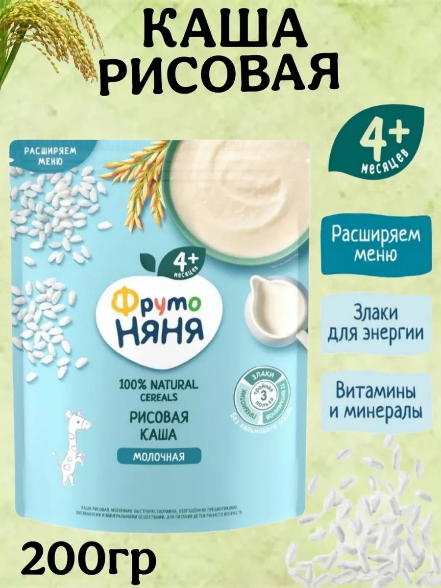 ФрутоНяня каша рисовая молочная быстрорастворимая, обогащённая пребиотиками, витаминами и минеральными веществами, для питания детей раннего возраста.