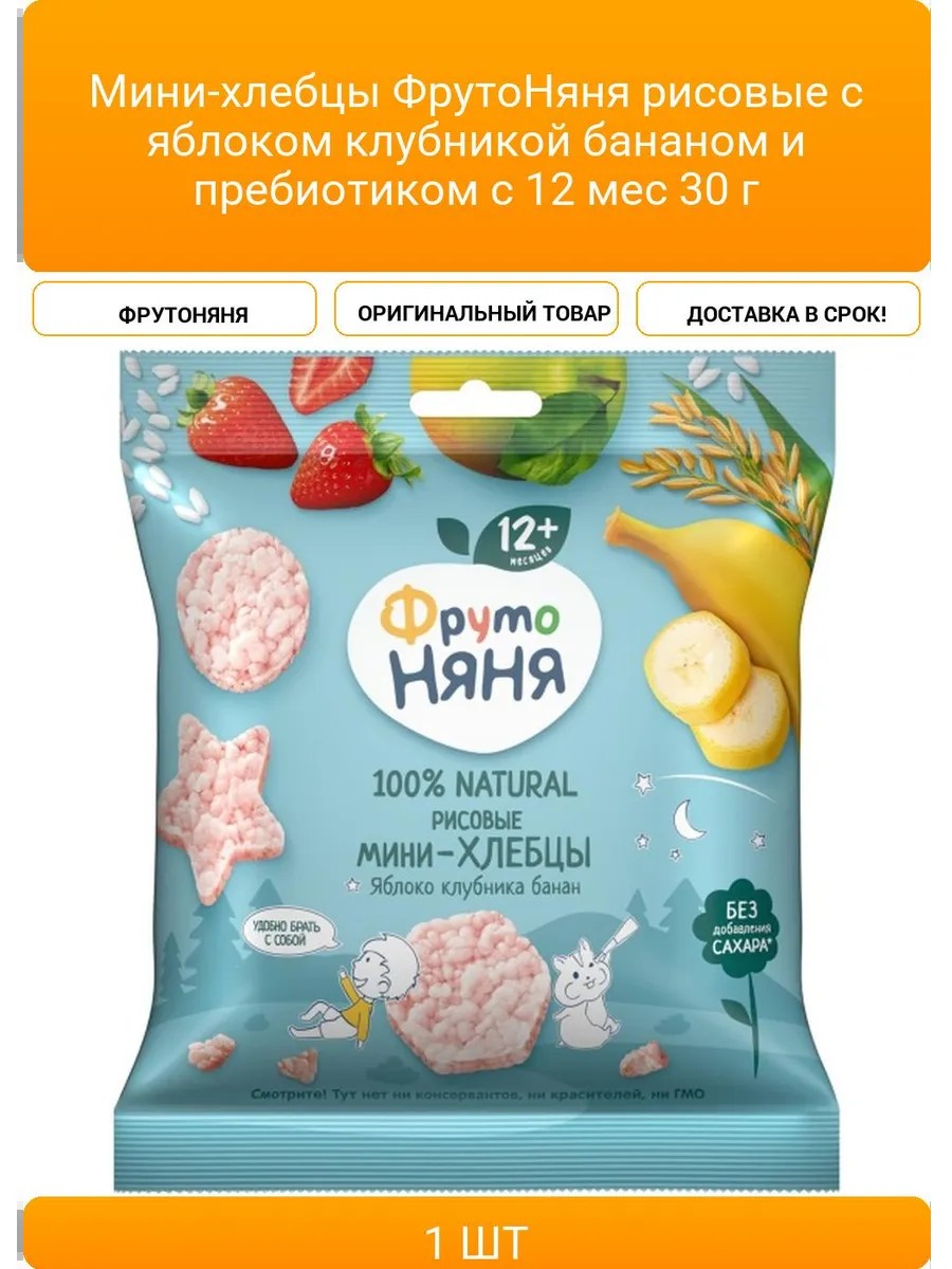 | Комплектация | Мини-хлебцы ФрутоНяня рисовые с яблоком клубникой бананом и пребиотиком с 12 мес 30 г |