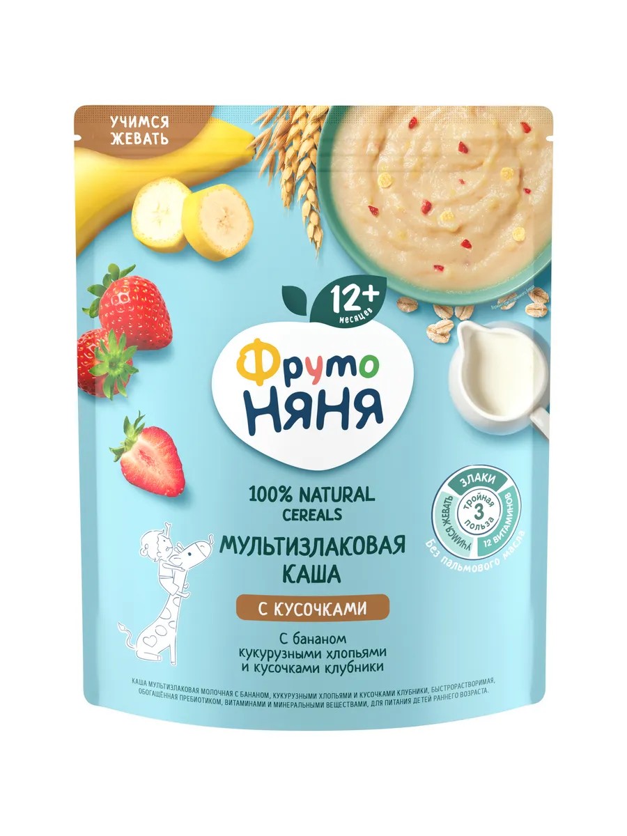 Полное наименование товараКаша ФрутоНяня мультизлаковая молочная с бананом-кукурузными хлопьями-кусочками клубники с 12 месяцев 200 г