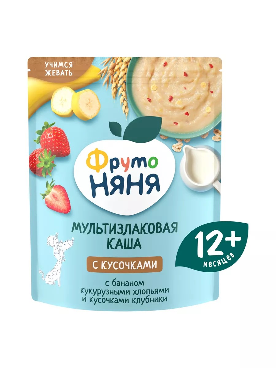Молочная детская мультизлаковая каша ФрутоНяня с бананом, кукурузными хлопьями и кусочками клубники — идеальный выбор для малышей старше 12 месяцев. Эта каша обогащена витаминами и минералами, которые способствуют гармоничному развитию ребёнка.