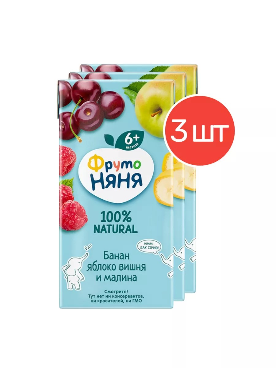 Нектар из банана, яблока, вишни и малины «ФрутоНяня» – это сочетание ярких и насыщенных вкусов натуральных ягод и фруктов, которое разнообразит рацион ребенка старше 6 месяцев. В составе только натуральные компоненты: пюре из спелых сладких бананов, а также яблочный, вишневый и малиновый соки. Нектар из банана, яблока, вишни и малины «ФрутоНяня» моментально зарядит малыша отличным настроением и дополнительной энергией, чтобы изучать окружающий мир стало еще веселее и интереснее.