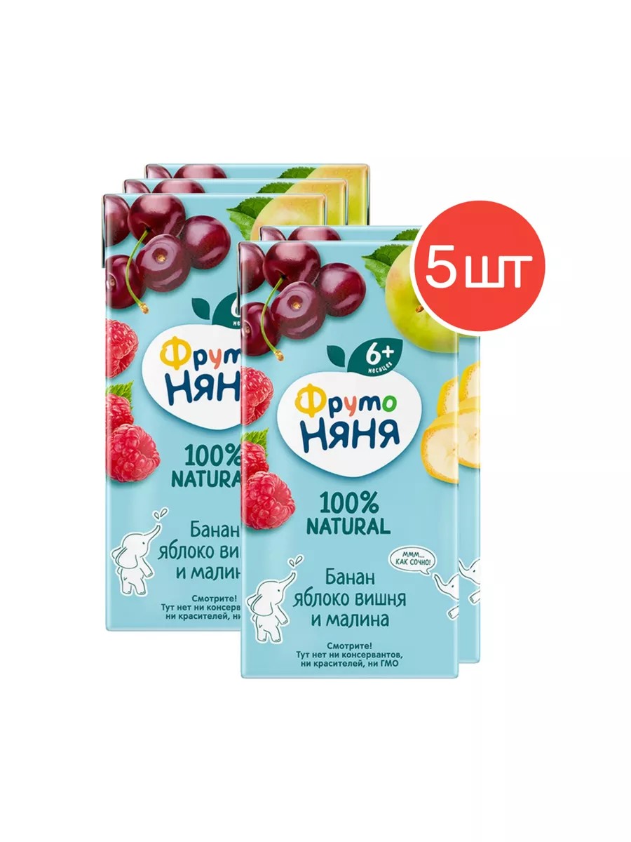 Нектар из банана, яблока, вишни и малины «ФрутоНяня» – это сочетание ярких и насыщенных вкусов натуральных ягод и фруктов, которое разнообразит рацион ребенка старше 6 месяцев. В составе только натуральные компоненты: пюре из спелых сладких бананов, а также яблочный, вишневый и малиновый соки. Нектар из банана, яблока, вишни и малины «ФрутоНяня» моментально зарядит малыша отличным настроением и дополнительной энергией, чтобы изучать окружающий мир стало еще веселее и интереснее.