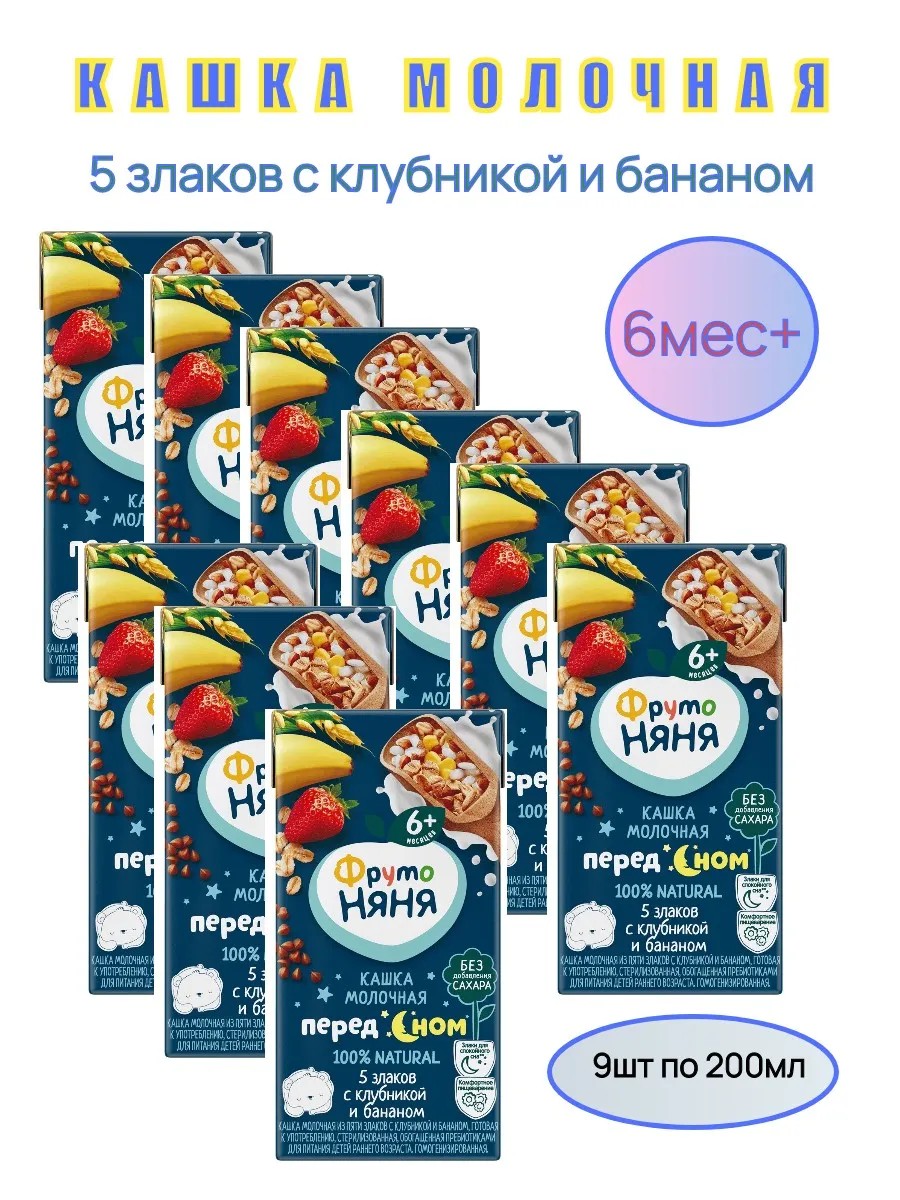 FrutoNyanya milk porridge made from five grains (rice, corn, wheat, buckwheat, and oats) with banana and strawberries, 200 ml, "before bedtime," is ready to eat. Suitable for infants aged 6 months and older. Contains inulin and improves digestion (clinically proven). Presented in compact tetrapak packaging, which reliably preserves the contents without adding preservatives.