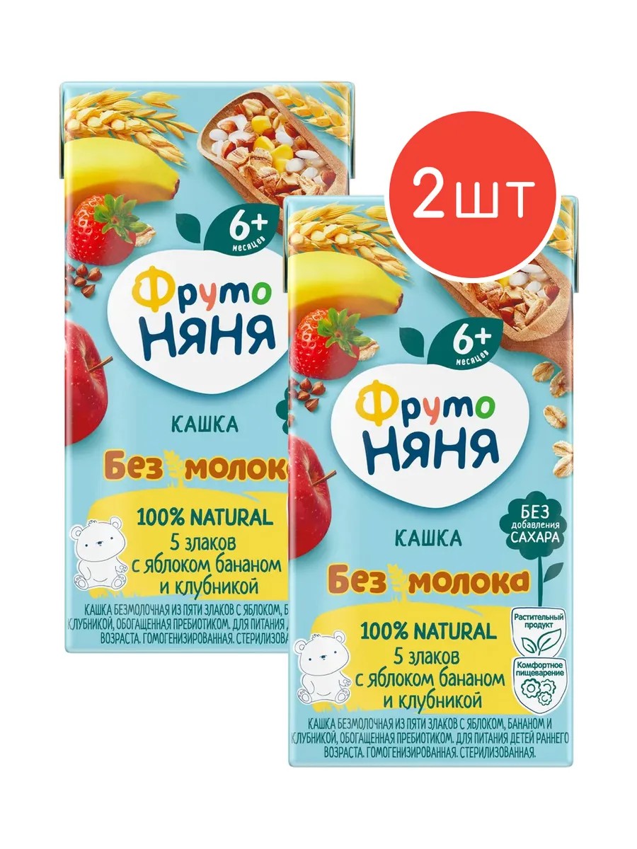 Жидкая безмолочная каша «ФрутоНяня» из пяти злаков с яблоком, бананом и клубникой подойдет в качестве сытного и вкусного завтрака для малышей с 6 месяцев с непереносимостью лактозы или отказывающихся от молока. Если ваш ребенок не любит молочные продукты, то эта фруктово-ягодная кашка ему точно понравится. В ее составе только натуральные продукты без сахара и молока: полезные злаки, соки и пюре из спелых фруктов и ягод. Продукт дополнительно обогащен пребиотиком, который помогает маленьким животикам лучше усваивать пищу.