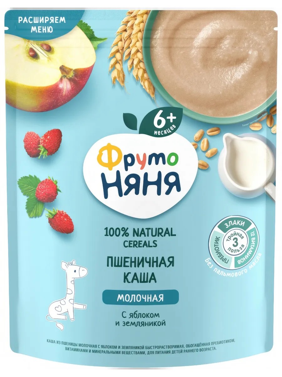 Каша Фрутоняня из пшеницы молочная с яблоком и земляникой быстрорастворимая, обогащенная пребиотиками, витаминами и минеральными веществами, для питания детей раннего возраста. Пшеница укрепляет защитные силы организма благодаря витаминам А, В, С, D, Е и ненасыщенными жирными кислотами, а также богата растительным белком и крахмалом. Пшеница, благодаря содержанию в ней клетчатки, стимулирует работу ЖКТ. Пектины, которыми богат данный злак, впитывают из кишечника вредные вещества. В состав каши входит натуральное пюре из яблок и земляники. Яблоки обогащают пюре пектинами и железом, а земляника витамином С. Витамины и минералы, входящие в состав сухих каш, не подвергаются температурной обработке и добавляются в кашу на финальном этапе производства, что позволяет сохранить все полезные свойства продукта. Инулин, входящий в состав каши - это натуральный пребиотик, который стимулирует рост полезной микрофлоры в кишечнике и улучшает пищеварение.