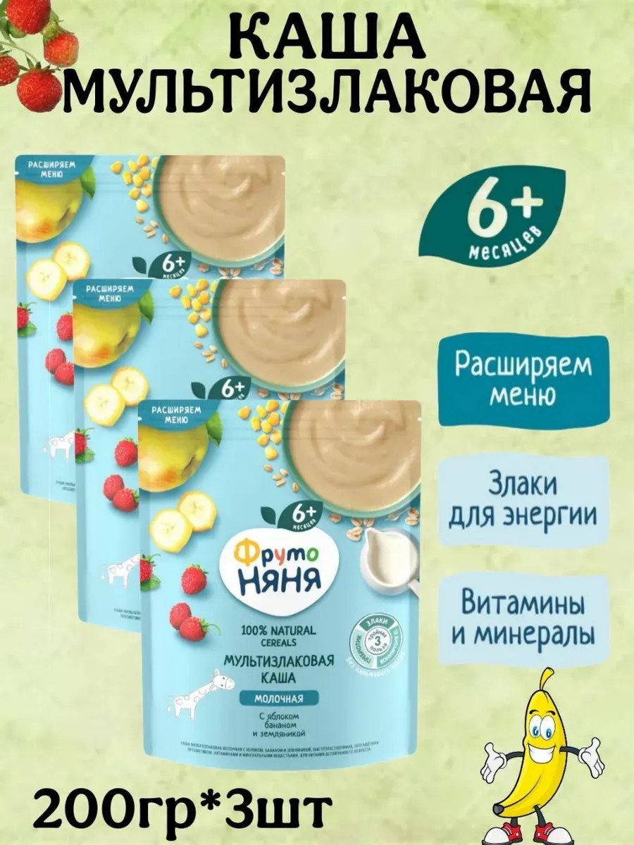 Каша мультизлаковая яблоко-банан-земляника с 6мес,200г,3шт