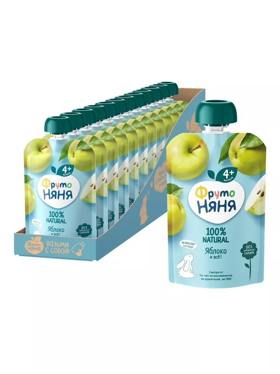 Frutonyanya Apple Puree, 90g, is a healthy snack for adults and children. Its convenient, soft packaging makes it perfect for taking on walks, to school, or to visit friends.