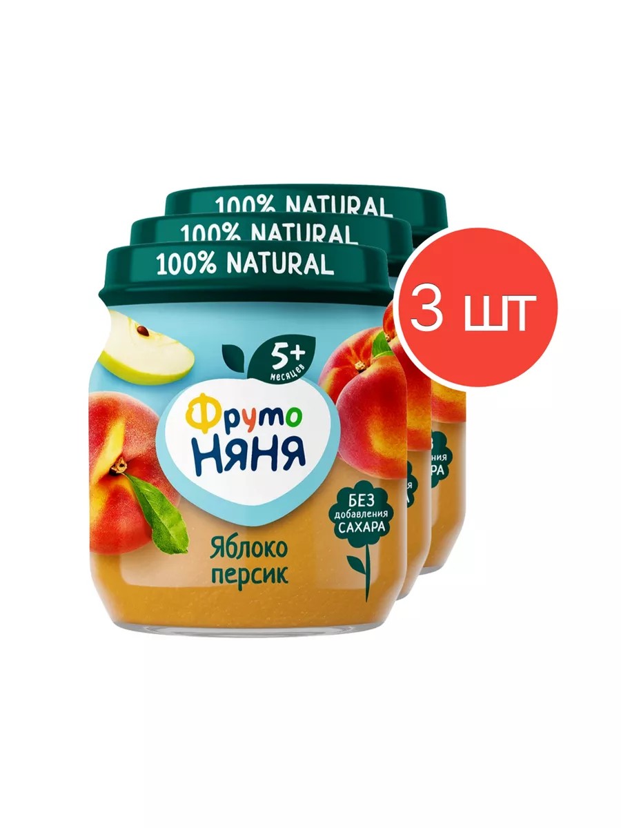 Фруктовое пюре «ФрутоНяня» из натуральных яблок и персиков — отличный способ разнообразить рацион питания вашего малыша. Продукт подходит для прикорма детей с 5 месяцев. В составе пюре «ФрутоНяня» из яблок и персиков только 100% натуральные ингредиенты без сахара, консервантов, красителей и ГМО. Комбинация спелых яблок и сочных персиков порадует малыша нежным вкусом, зарядив пользой и энергией.