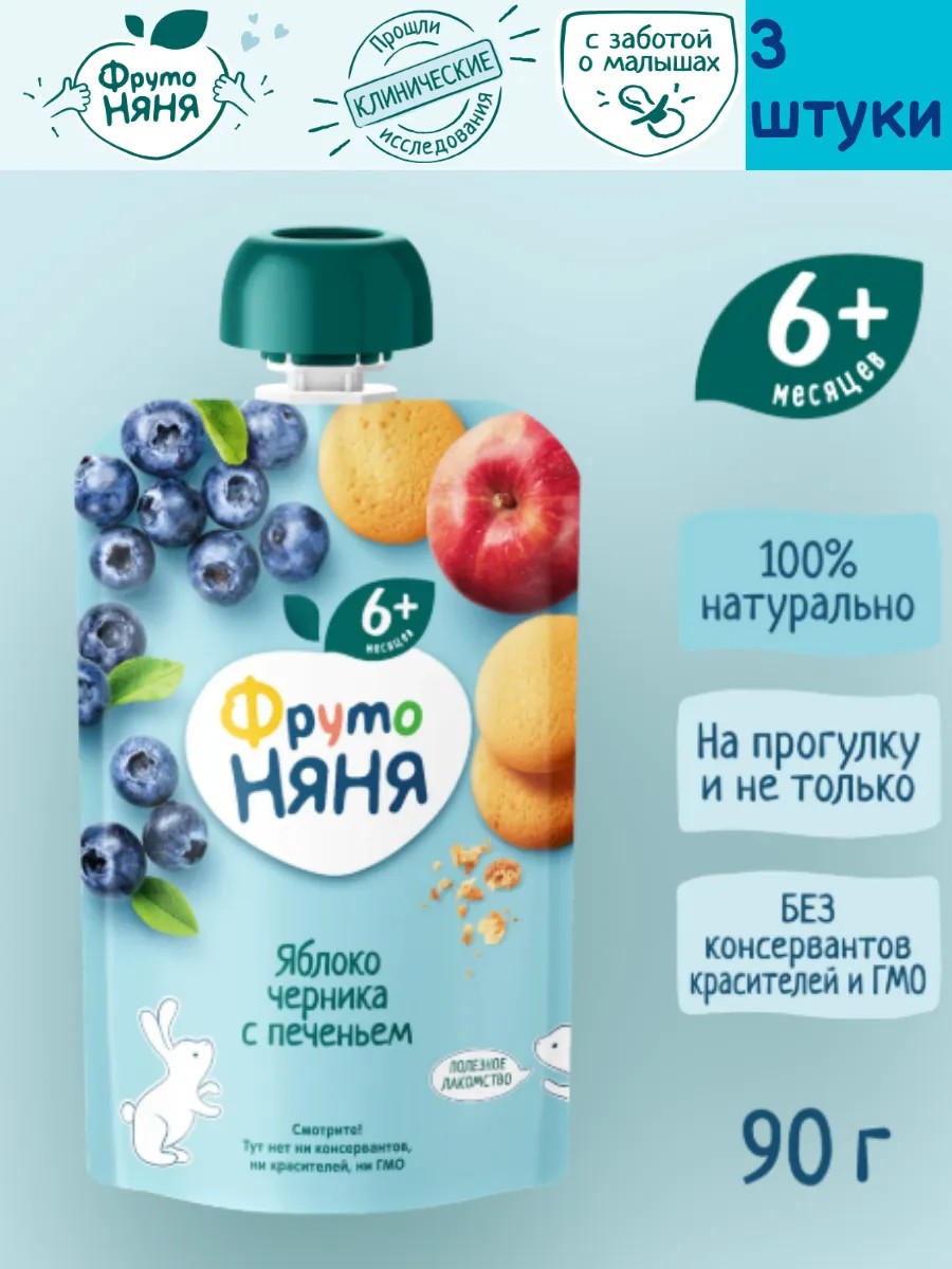 Пюре детское фруктовое, яблоко, черника, печенье 90 гр, 3 шт