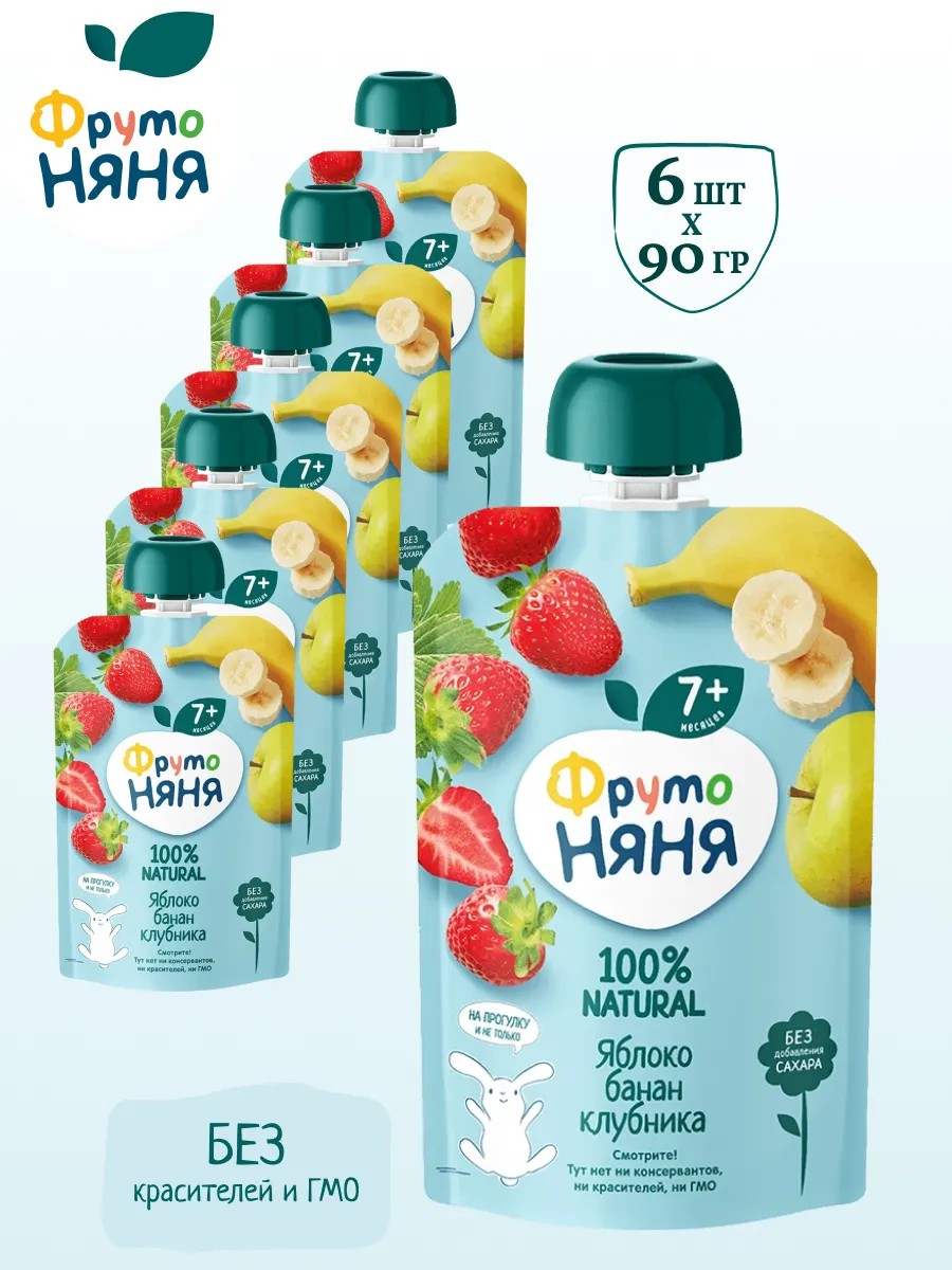 Пюре детское яблоко, банан, клубника от Фрутоняня это вкусный и полезный перекус для малышей. Вкусная еда без сахара для полезного питания маленьких детей. Диетическое и правильное пюре богатое микроэлементами для иммунитета. Удобный набор из 6 паучей в мягкой упаковке для перекуса в дорогу. Рекомендуется детям для начала прикорма. Это здоровый выбор десерта для ребенка без добавления сахара. Пюрешки удобны для перекуса в дороге, на прогулке, в путешествии или в гостях. Фруктовое пюре в мягкой упаковке это вкусный и полезный перекус, который удобно брать с собой, а яркая мягкая упаковка привлечёт внимание Вашего малыша и позволит ему есть самостоятельно. В этом пюре только отборные фрукты и никакого добавленного сахара, чтобы малышу было полезно и вкусно. Это пюре из натуральных фруктов, выращенных без использования химических удобрений и пестицидов, что делает его безопасным и полезным для детей всех возрастов. Пюре богато витаминами и минералами, необходимыми для правильного развития и укрепления иммунитета малышей. Благодаря своей натуральной основе и отсутствию добавок, является отличным дополнением к любому детскому рациону, обеспечивая приятный вкус и питательную ценность. Продукт готов к употреблению. Комплект 6 штук.