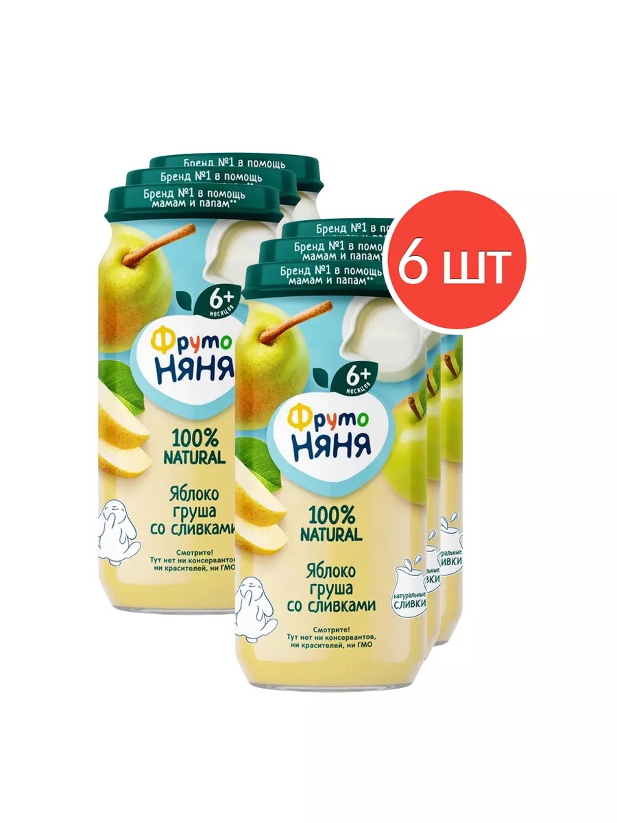 Пюре «ФрутоНяня» из яблок и груш со сливками порадует вашего малыша сочетанием спелых фруктов и отборных сливок. В его составе 100% натуральные ингредиенты, которые помогут малышу зарядиться энергией для полноценного роста и развития. Пюре разнообразит рацион ребенка с 6 месяцев и подарит ему новые впечатления. Упаковки объемом 250 мл хватит на несколько приемов. Открытую банку необходимо хранить в холодильнике.