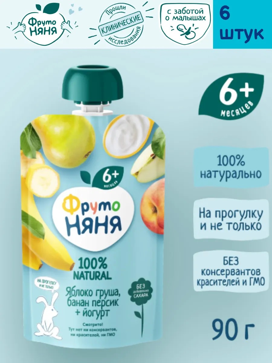 Пюре из яблок, груши, банана, персика и йогурта, 90 г, 6 шт