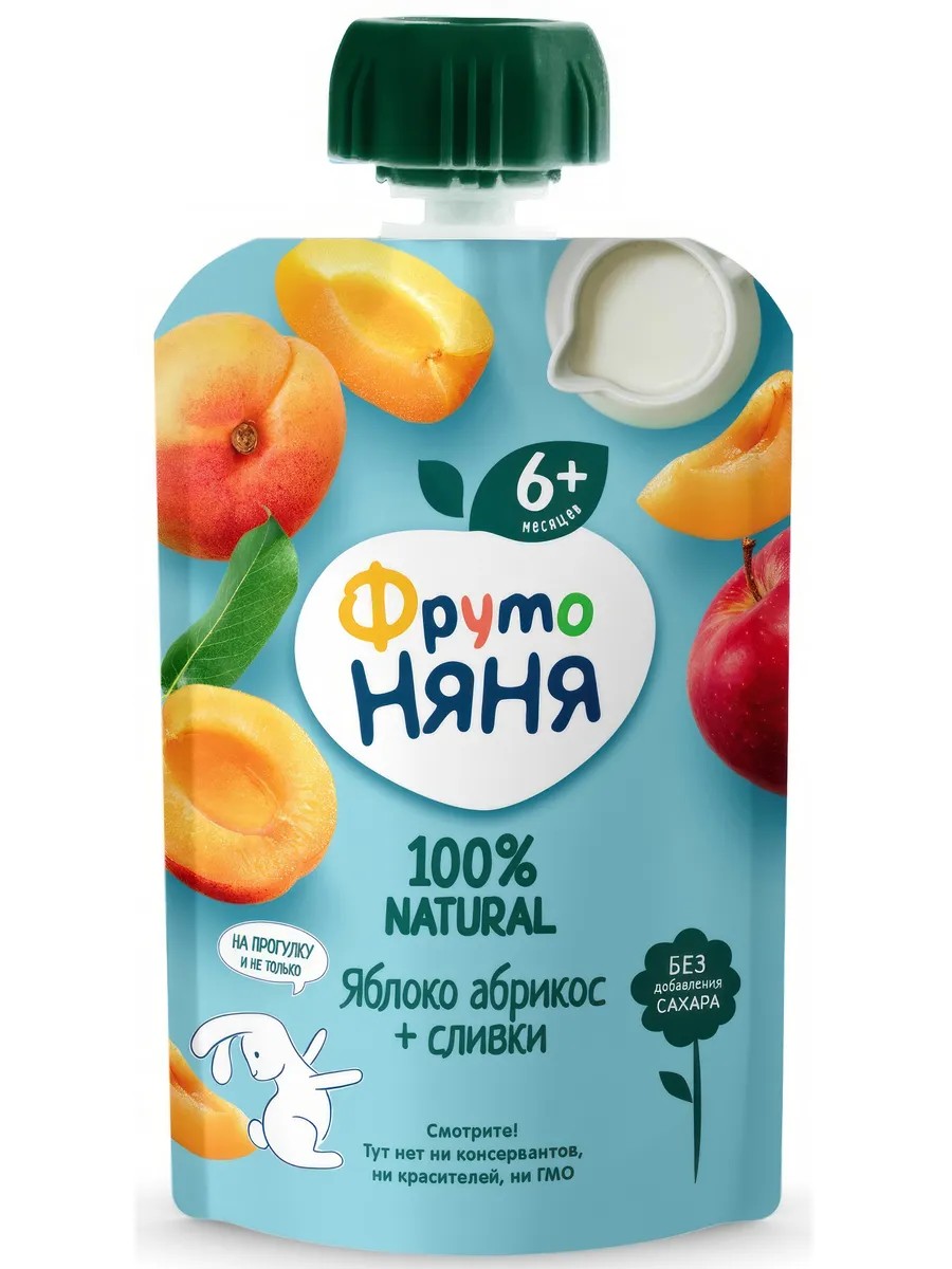 FrutoNyanya apple and apricot puree with cream, 90g, is ideal for babies aged six months and older. It comes in a soft, lidded package, making it easy to take on walks. This puree has a delicate, creamy flavor with bright notes of ripe apricot and juicy apple. It contains no preservatives or colorings and is easily digestible. Consuming this fruit puree helps strengthen the immune system and normalize digestion. It quickly satisfies hunger and provides long-lasting energy.