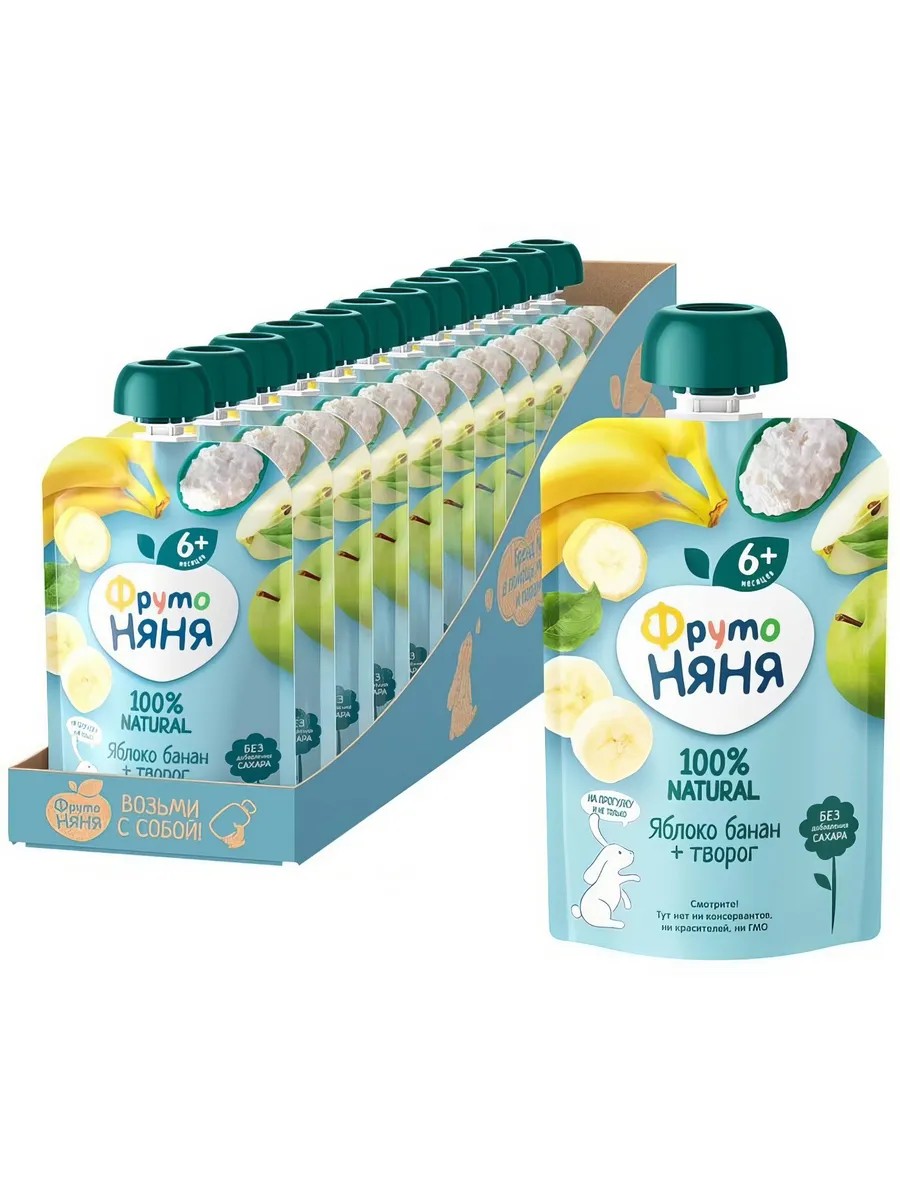 Фруктовое пюре ФрутоНяня Яблоко, банан, творог в мягкой упаковке это вкусный и полезный перекус, который удобно брать с собой, а яркая мягкая упаковка привлечёт внимание вашего малыша и позволит ему есть самостоятельно. Нежные бананы, спелые яблоки и свежий творог обеспечат организм вашего малыша природной пользой и энергией для гармоничного роста!