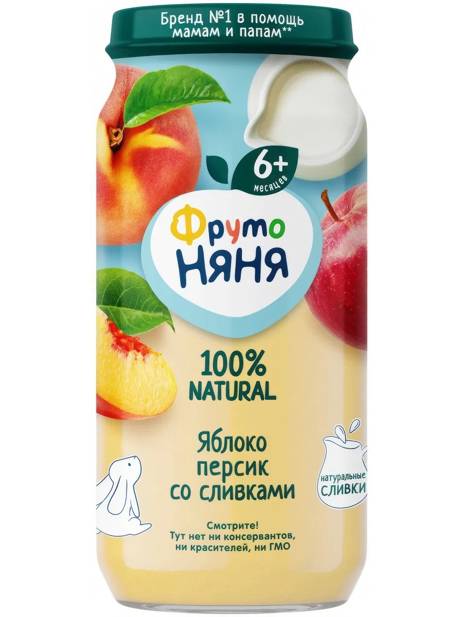 Frutonyanya Apple-Peach-Cream Puree, 250g, is a natural product made from apple and peach puree with selected cream and sugar (no starch). Recommended for children aged 6 months and older, starting with 1 teaspoon twice daily, gradually increasing to 100g by 12 months. Contains no preservatives, colors, flavors, or GMOs. Stir before feeding. Do not use if the can does not click when opened. Please note: Before introducing any new product into your child's diet, be sure to consult your pediatrician!