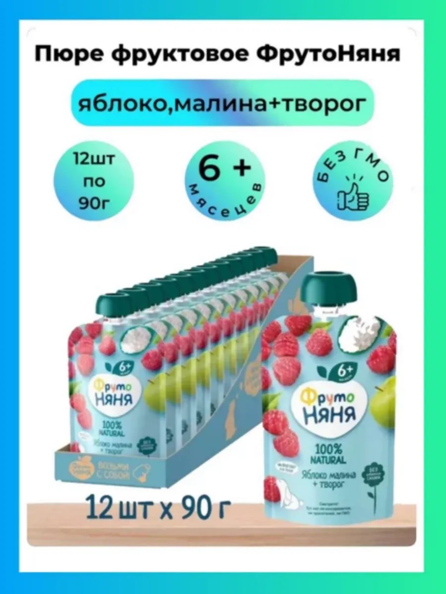| Комплектация | Пюре фруктовое яблоко,малина+творог 90г х 12 шт |