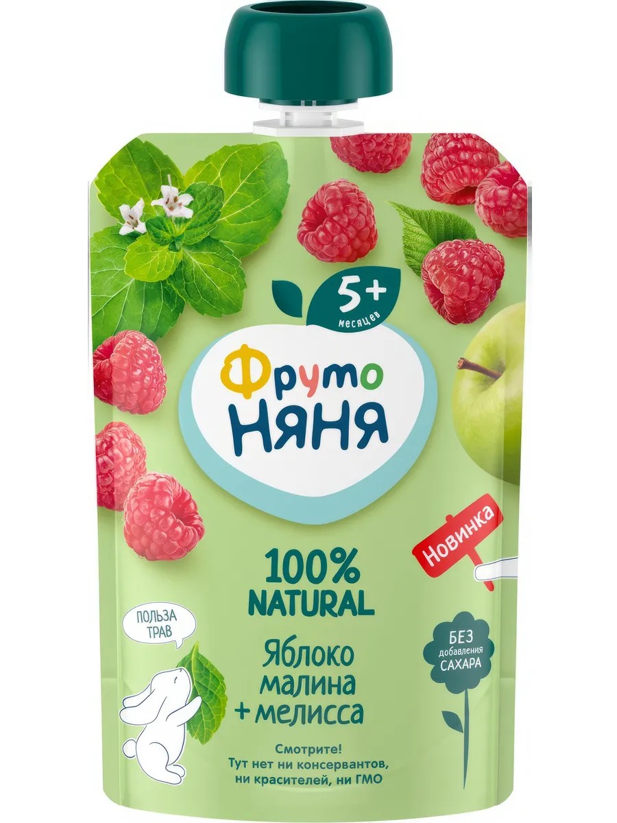 Фруктовое пюре в мягкой упаковке ФрутоНяня Яблоко, малина, мелисса это вкусный и полезный перекус, который удобно брать с собой, а яркая мягкая упаковка привлечёт внимание вашего малыша и позволит ему есть самостоятельно. Отборная малина, спелые яблоки и натуральный экстракт мелиссы обеспечат вашего малыша природной пользой и энергией для гармоничного роста!