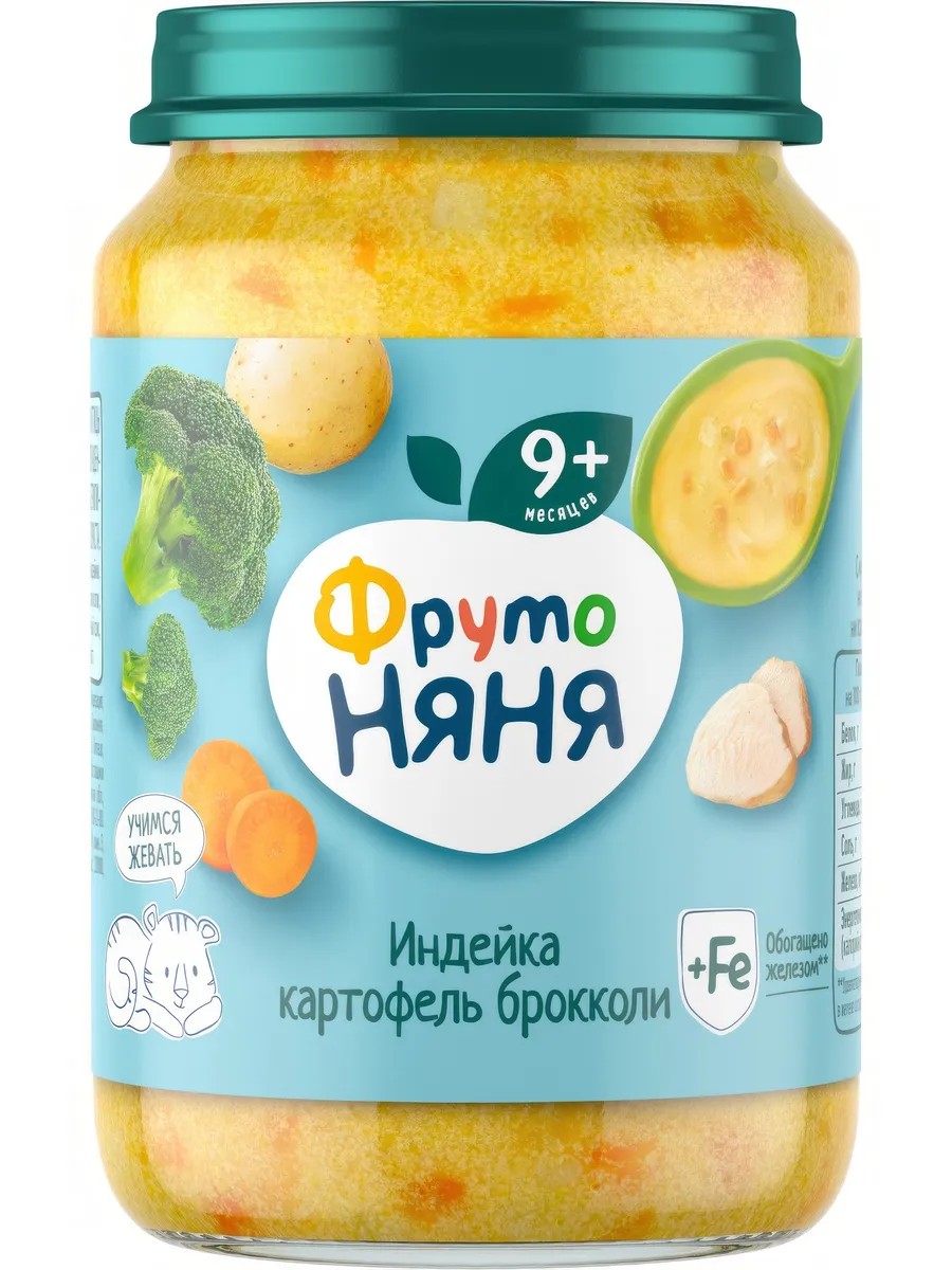 Пюре Фрутоняня индейка-картофель-брокколи, 190г представляет собой продукцию с ярким и насыщенным вкусом, которая отличается высоким содержанием калия. Изготовлен из ингредиентов натурального происхождения без использования искусственных добавок, консервантов, красителей и ГМО. Продукт полностью готов к употреблению. Перед кормлением содержимое емкости необходимо тщательно перемешать.