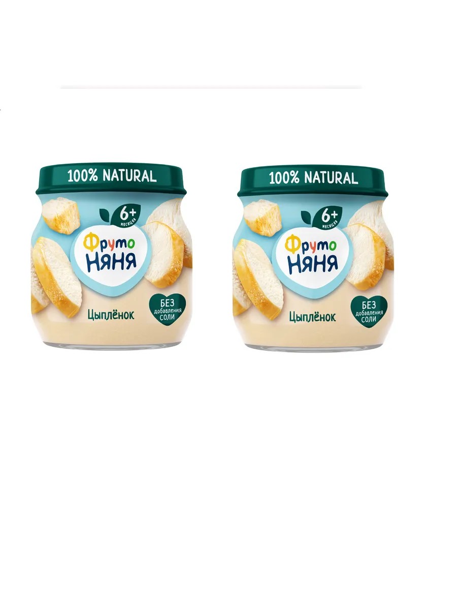 Frutonyanya, Chicken Meat Puree for Babies from 6 Months, 80g, 2 pcs. Perfect for introducing meat to babies. Clean ingredients: no salt, no starch, no soy protein, and no GMOs. Ingredients: Chicken, rice flour, vegetable oil, drinking water.