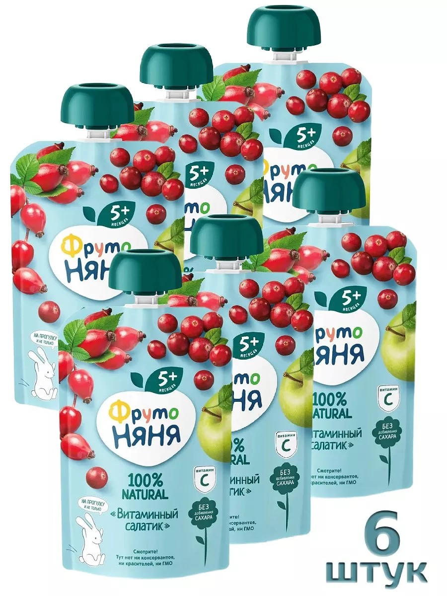 ФрутоНяня пюре из яблок, шиповника и клюквы, обогащенное витамином С «витаминный салатик» для питания детей раннего возраста.