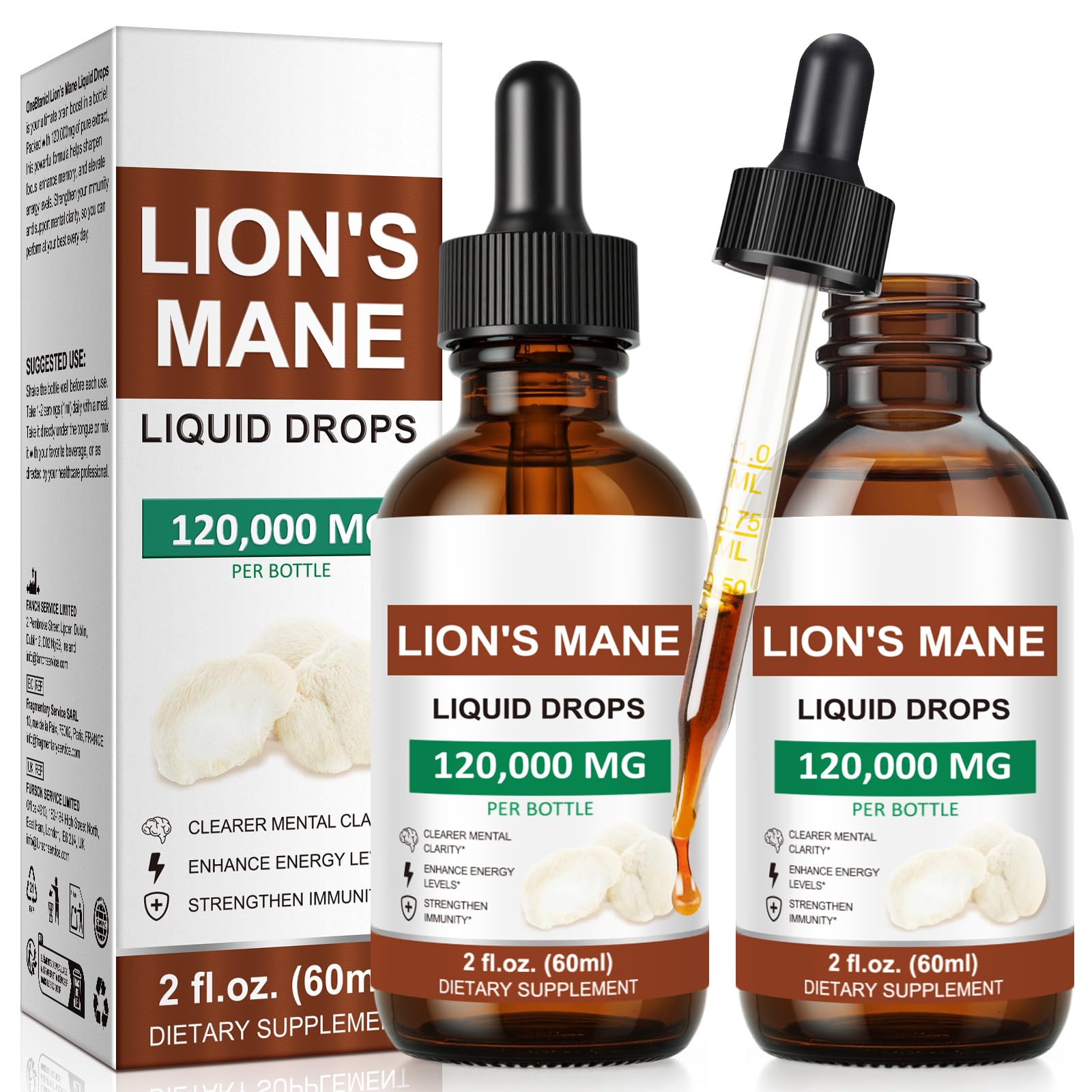 " Lion's Mane Liquid Drops is your ultimate brain boost in a bottle! Packed with 120,000mg of pure extract, this powerful formula helps sharpen focus, enhance memory, and elevate energy levels. Strengthen your immunity and support mental clarity, so you can perform at your best every day. These statements have not been evaluated by the Food and Drug Administration. This product is not intended to diagnose, treat, cure or prevent any disease. WARNING: Do not exceed the recommended daily dosage. Consult with your healthcare provider before starting any new supplement, especially if you have any medical conditions, are pregnant, nursing, or taking other medications. Individual results may vary. STORAGE: Store in a cool, dry place away from direct sunlight. Keep out of reach of children. Do not use it if the safety seal is broken or missing. For best quality, use within the expiration date printed on the package. "