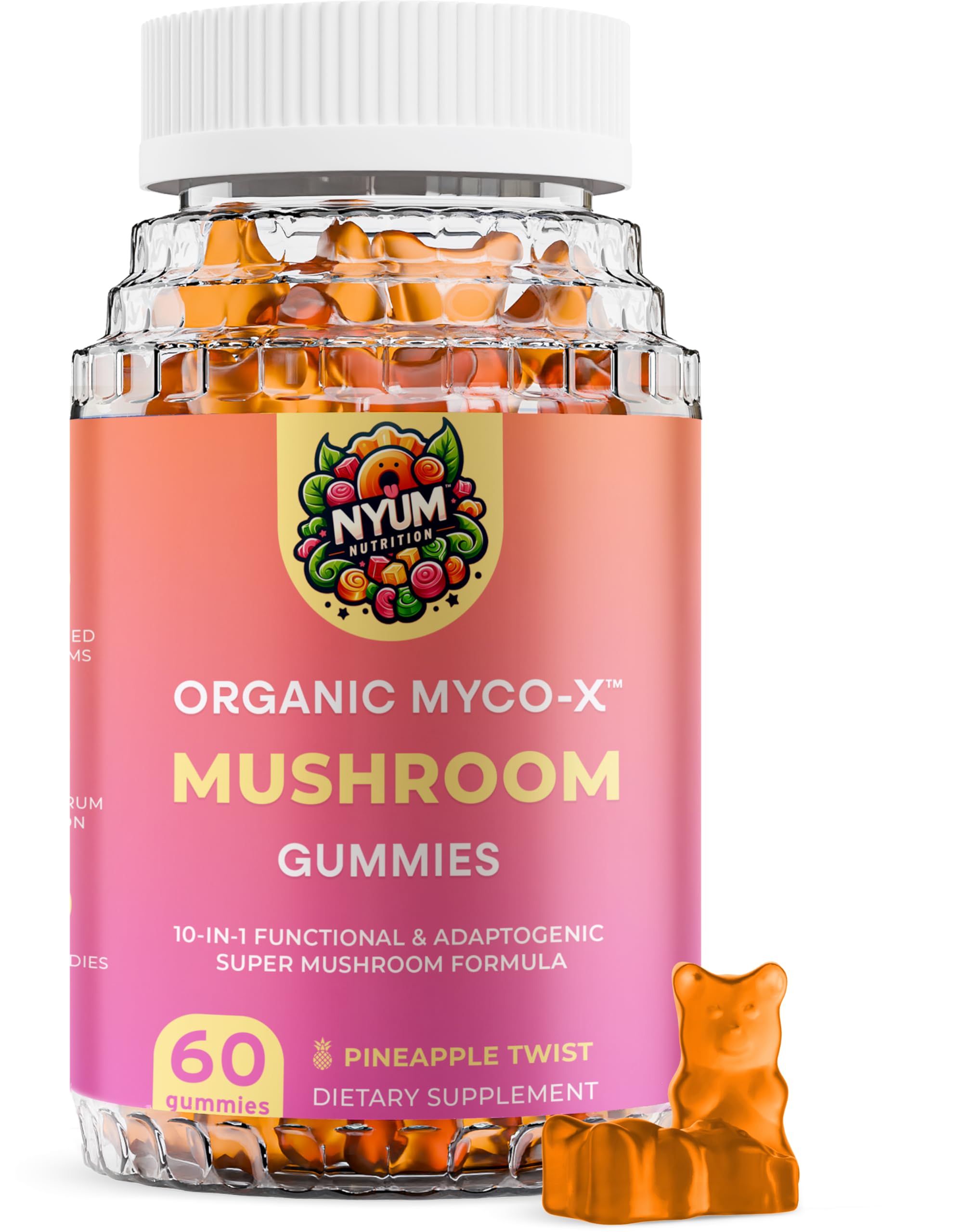 FUCOIDAN FORCE Nyum Nutrition Organic MYCO-X Mushroom Gummies 10-in-1 Formula Pineapple Twist 60 Count Orange/Pink