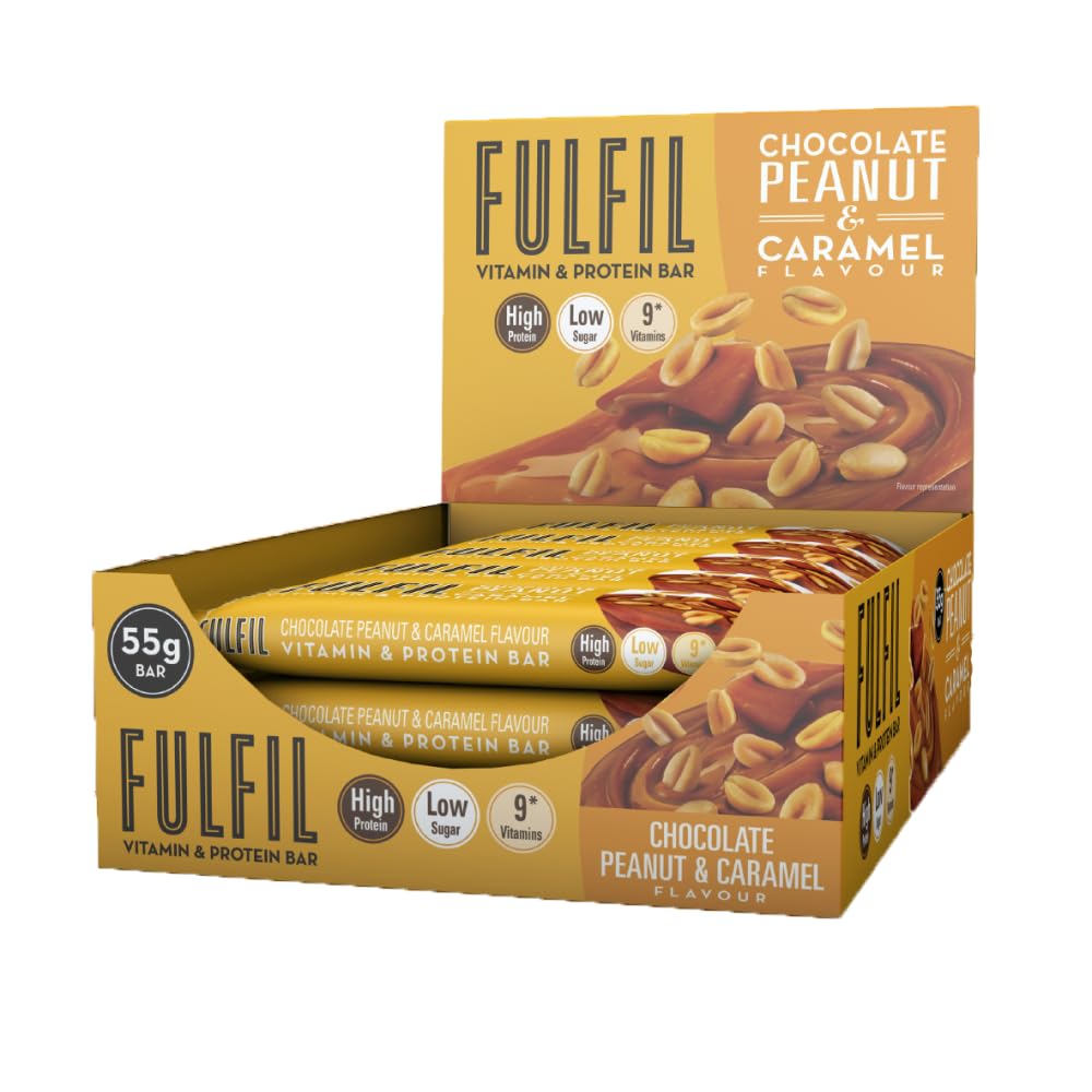 Fulfil bars, available in boxes of 15, are protein bars (with sweetener) enriched with vitamins from the Fulfil brand. Nourishing your muscles with protein is crucial for building and maintaining muscle mass. Thanks to the Fulfil bar, your muscles will be satisfied with 20g of protein per bar, in addition to 3.7g of fiber. Furthermore, each bar contains 9 vitamins, each playing a different role in the body. These vitamins help reduce fatigue (vitamins C, B2, B3, B5, B6, and B12). Vitamin B1 contributes to normal energy metabolism. Vitamin E helps protect cells against oxidative stress. Finally, one bar provides 214 calories with only 2.1g of sugar, allowing you to fuel up before your workout or recover after intense exercise. Fulfil bars are super crunchy and come in four incredibly delicious flavors: Chocolate Brownie, Hazelnut, Peanut Caramel, and Salted Caramel. INSTRUCTIONS FOR USE Eat the bar directly.FULFIL Boîte De Barres (15x55g) protéinées enrichies en vitamines, Peanut CaramelDESCRIPTION DU PRODUIT DESCRIPTION DU PRODUIT Les barres Fulfil , disponibles par boîte de 15 , sont des barres protéinées (avec édulcorant) enrichies en vitamines de la marque Fulfil . Nourrir tes muscles en protéines est très important pour aider à développer et à maintenir ta masse musculaire . Grâce à la barre fulfil tes muscles seront rassasiés avec 20 g de protéines par barre qui s'ajoutent aux 3,7 g de fibres . De plus, une barre contient 9 vitamines qui vont chacune avoir un rôle différent pour l'organisme. En effet, les vitamines présentes contribuent notamment à réduire la fatigue (vit. C, B2, B3, B5, B6, B12) . La vitamine B1 aide à un métabolisme énergétique normal . La vitamine E participe à protéger les cellules contre le stress oxydatif . Pour finir, une barre t'apporte 214 calories pour seulement 2,1 g de sucres , ce qui te permettra de faire le plein d'énergie avant ta séance ou pour récupérer après un effort intense. Les barres Fulfil sont hyper croquantes et sont disponibles à travers 4 saveurs ultra délicieuses : Chocolat brownie , Noisette , Peanut caramel et Caramel salé . MODE D'EMPLOI Manger la barre directement.