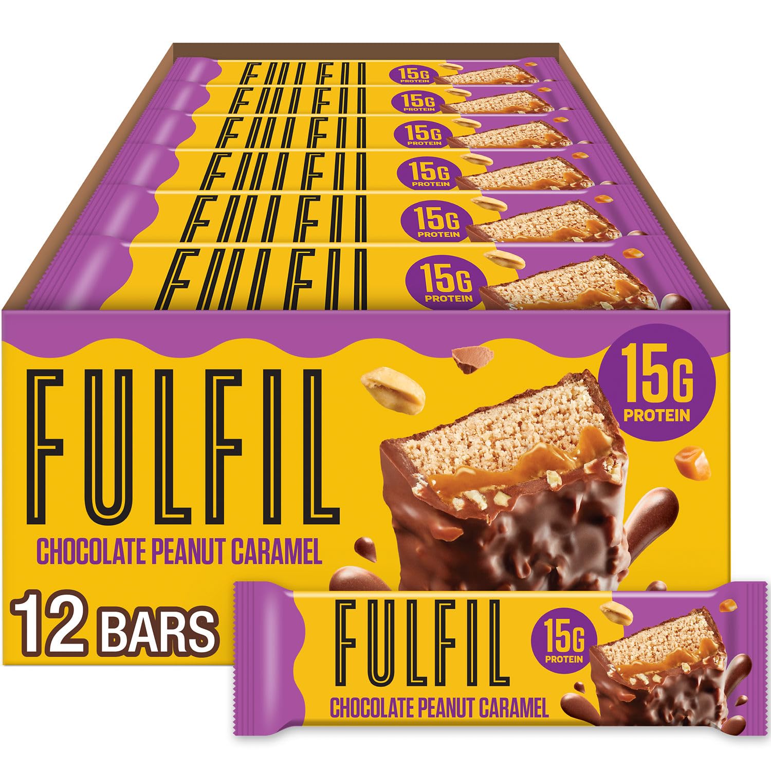 COLD PACK SHIPPED: items will be shipped with cold packs to prevent the product from melting during the summer months if needed. GOOD SOURCE OF PROTEIN: Treat yourself with our delectable protein bars packed with 15g of protein, 2g of net carbs, and 1g of sugar. You are getting benefits that fulfill!. HIGH QUALITY INGREDIENTS: Enjoy the sweet and salty flavor combination of peanuts, caramel flavored creme and chocolatey goodness by biting into FULFIL snack bars all year long. GLUTEN FREE: This gluten free protein bar will become your new favorite pantry staple complete with peanuts, caramel flavored creme and rich chocolate flavor. EVERYDAY PROTEIN: Enjoy your Chocolate Peanut Caramel flavored protein bar full of flavor at work, before or after the gym, on the go, hiking, traveling, at the office, and all the ordinary days in-between!. WE SWEAR, IT'S A PROTEIN BAR: Enjoy a 12 count of our 40g FULFIL Chocolate Peanut Caramel Flavored Protein Bars with 15g protein that's so good you'll think it is candy.