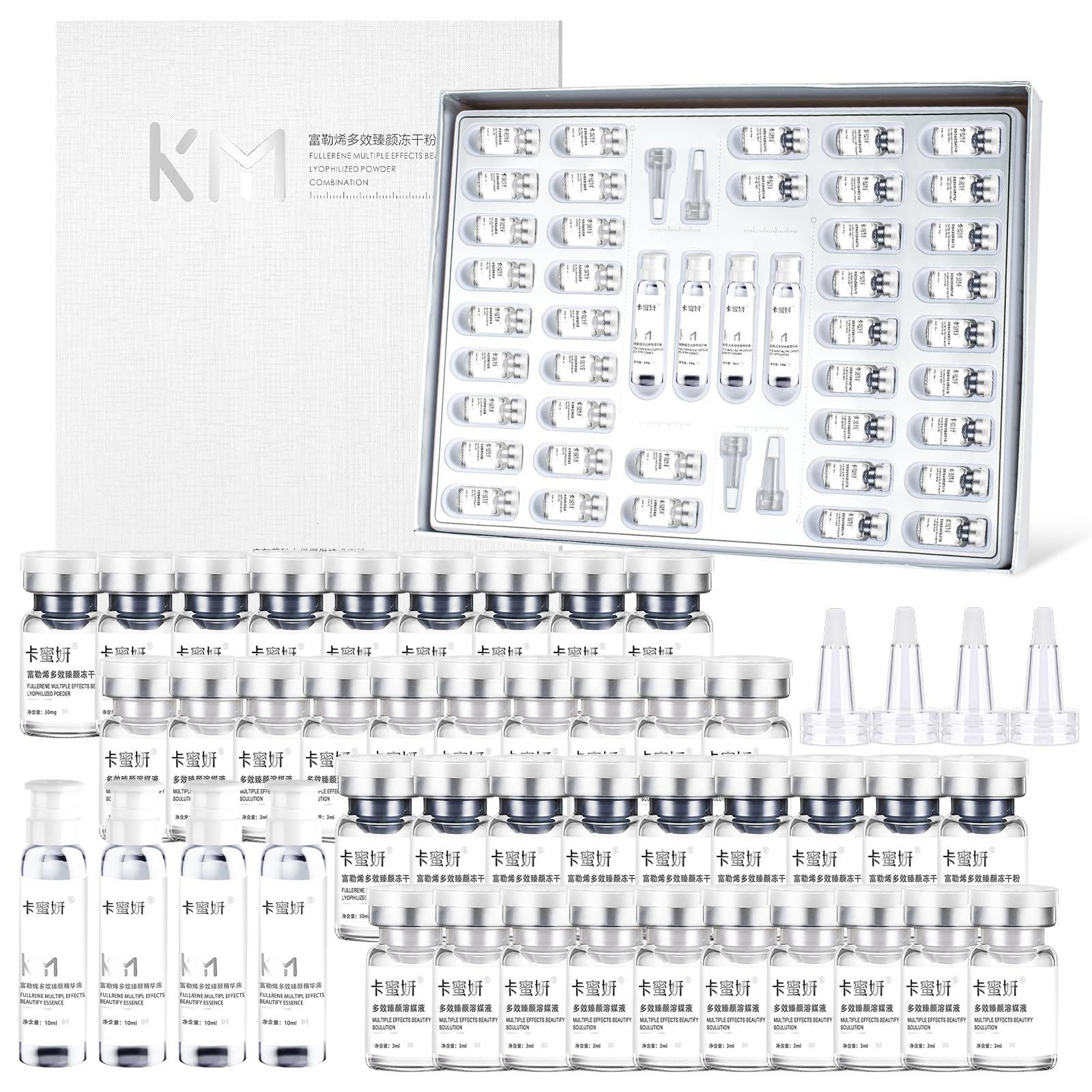 Best Gift for Women: The gift box contains Fullerene Freeze-dried Powder 50mg x 20pcs Fullerene Soluble Liquid 3ml x 20pcs Fullerene Serum 10ml x 4pcs 4 teardrop tips, it is the best gift for Valentine's Day, Christmas and all kinds of anniversaries!. Design Innovation Advanced Functions: 1, thickened design:The bottle thickened design of the vial, using strict production standards, highly transparent texture, firmly lock each drop of essence, better preservation of the efficacy of the medicine 2, low-temperature extraction:In a vacuum (1.3-13Pa) environment, the wet substance or solution at lower temperatures (-10 C 50 C) under the freezing of the solid state 3, sealing design:of the bottle mouth seal design, not only can be very well preserved Product, there is simple operation, and does not hurt your hands. Usage: 1, according to the top of the bottle cap arrow tips to open the lid and open the plug 2, the solvent liquid slowly poured into the lyophilized powder 3, set on the dropper head of the lyophilized powder will be shaken well, so that it is dissolved in which 4, squeeze the dropper head, take the appropriate amount of coated with the skin, massaging until absorbed 5, followed by the appropriate amount of hyaluronate firming serum, coated on the face of the skin to be absorbed 6, the basic skincare can be coated with the appropriate amount of lotion, face cream. Freeze-dried powder utilizes "freeze-drying technology", which freezes the liquid into a solid state under a huge low-temperature environment, and sublimates and dries the water into a powder, which locks in the original vitality of the ingredients, and enables the ingredients to play a good role in their efficacy. Fullerene peptide extract: fullerene molecules antioxidant is 172 times that of VC, can protect 11 hours, activity to reach more than 90 , to resist oxidation, return to the water tender teenage skin!.
