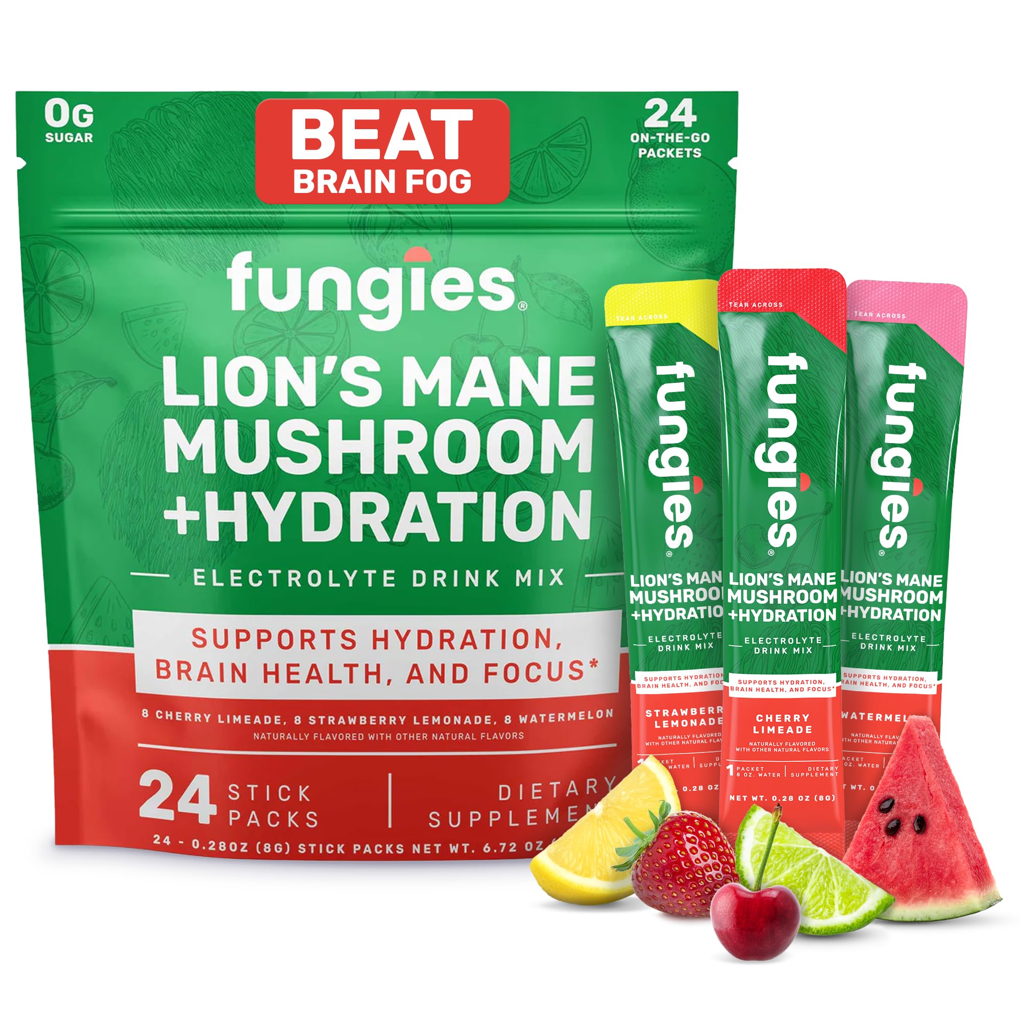 Simple, Supercharged Wellness: Fungies is a convenient way to add functional mushrooms to your daily routine. We're building a healthier world, one delicious gummy at a time. Refreshing Boost for Busy Lives: Whether you're a parent, athlete, or just someone who needs a hydration boost, this mushroom-infused drink mix is a convenient and delicious way to replenish electrolytes anytime, anywhere. Quality You Can Count On: This drink mix is crafted with love for your family's wellness. Free from additives, artificial colors and flavors, plus non-GMO, gluten-free, gelatin-free, and vegan. Our mushroom supplements are made in a cGMP-registered facility, so you know exactly what you're getting. Just the good stuff—nothing else. A Drink Brains Love: Start your morning with focused energy, recharge in the afternoon, or fuel up before a workout. Mix one stick pack with 8 ounces of water, stir well, and enjoy for on-the-go hydration. Fuel Your Focus: This sugar-free mushroom drink mix combines 1000mg of Organic Lion's Mane Mushroom Extract and electrolytes like magnesium, calcium, and potassium to elevate your brain health, enhance mindfulness, and optimize hydration. Hydration Made Delicious: Elevate your hydration and mental focus with Fungies Lion's Mane Mushroom Hydration Electrolyte Drink Mix! This variety pack includes 3 delicious flavors - Strawberry Lemonade, Cherry Limeade, and Watermelon – to keep you hydrated and boost cognition. Includes 24 variety stick packs.