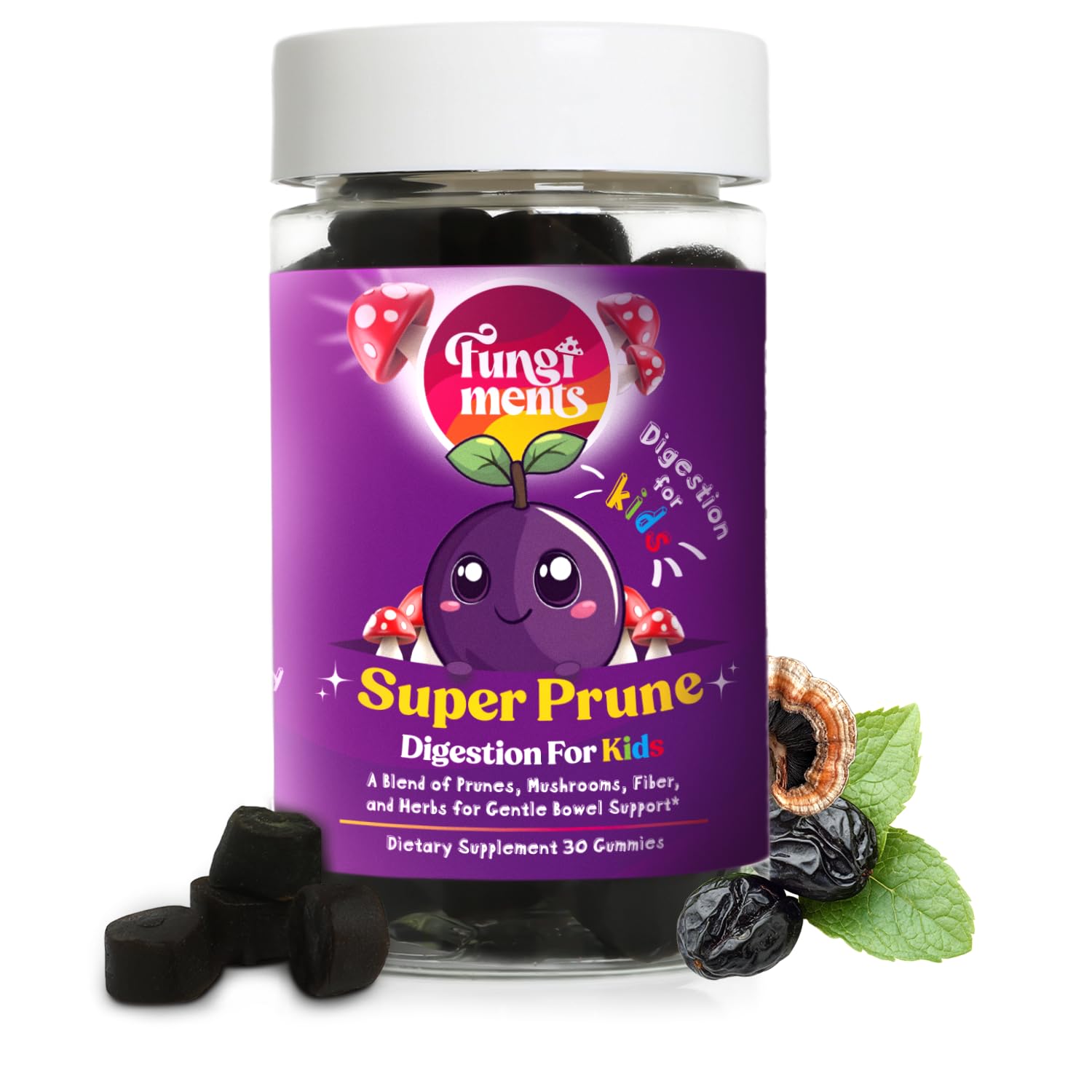Fungiments Super Prune Kids - Great for Constipation Relief - Mushroom Supplement - Turkey Tail Mushrooms, Fiber, Rhubarb, Prunes, Ginger, Chamomile (30 Mushroom Gummies) Super Prune Kids 30 Count (Pack of 1)