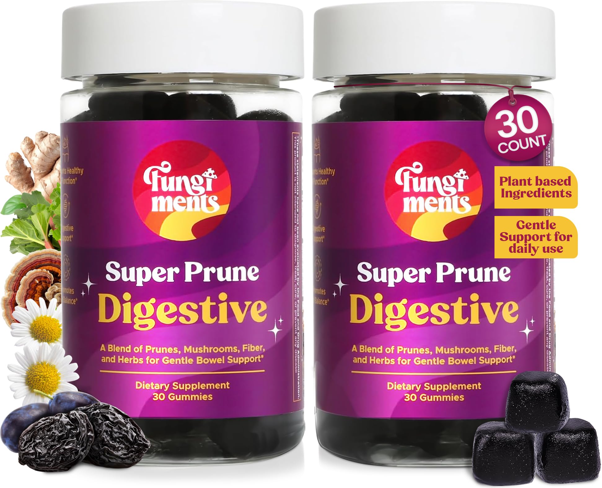 Fungiments Super Prune - Mushroom Supplement - Turkey Tail Mushrooms Fiber Rhubarb Prunes Ginger Chamomile - Debloating Constipation Relief (2-30 Count Gummies)