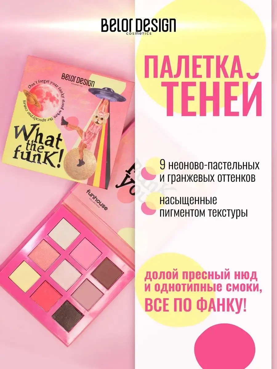 Палетка теней для век Funhouse What the Funk от белорусского бренда декоративной косметики Belor Design — это настоящий взрыв эмоций! Яркий, насыщенный и немного безумный микс из 9 неоново-пастельных и гранжевых оттенков теней для глаз заставит вас воскликнуть: «What the Funk!». В палитре идеально сочетаются игристые шиммерные оттенки с дымчатыми, а переходные матовые цвета неонового лимончелло, фуксии и базового тауп позволят вам разрушить стереотипы о красоте и создать по-настоящему весёлый образ. Палетка предлагает 5 матовых, 1 сатиновый и 3 сияющих оттенка, что открывает множество возможностей для создания не только бунтарских, но и монохромных дневных макияжей. Мягкая, насыщенная пигментом текстура легко растушевывается, позволяя создавать плавные переходы и градиенты. Долой скучный нюд и однотипные смоки! Пусть ваш макияж будет по-настоящему «фанковым»! Нанесите выбранные оттенки на веко с помощью мягкой кисти или подушечки пальцев. Тщательно растушуйте по направлению к вискам, создавая плавные цветовые переходы.