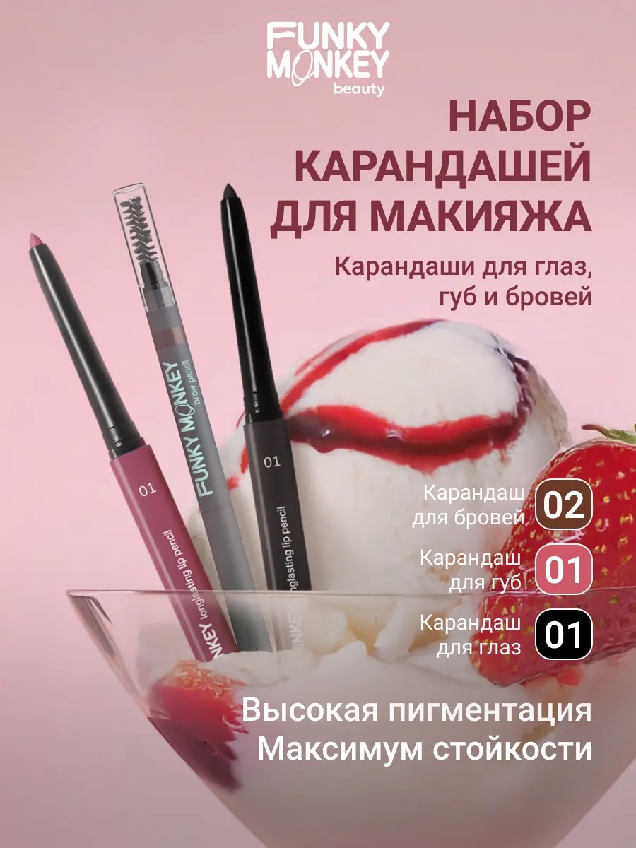 For your convenience, we've prepared the perfect set from the Funky Monkey decorative cosmetics brand: an eyebrow pencil, lip pencil, and eye pencil in one kit.