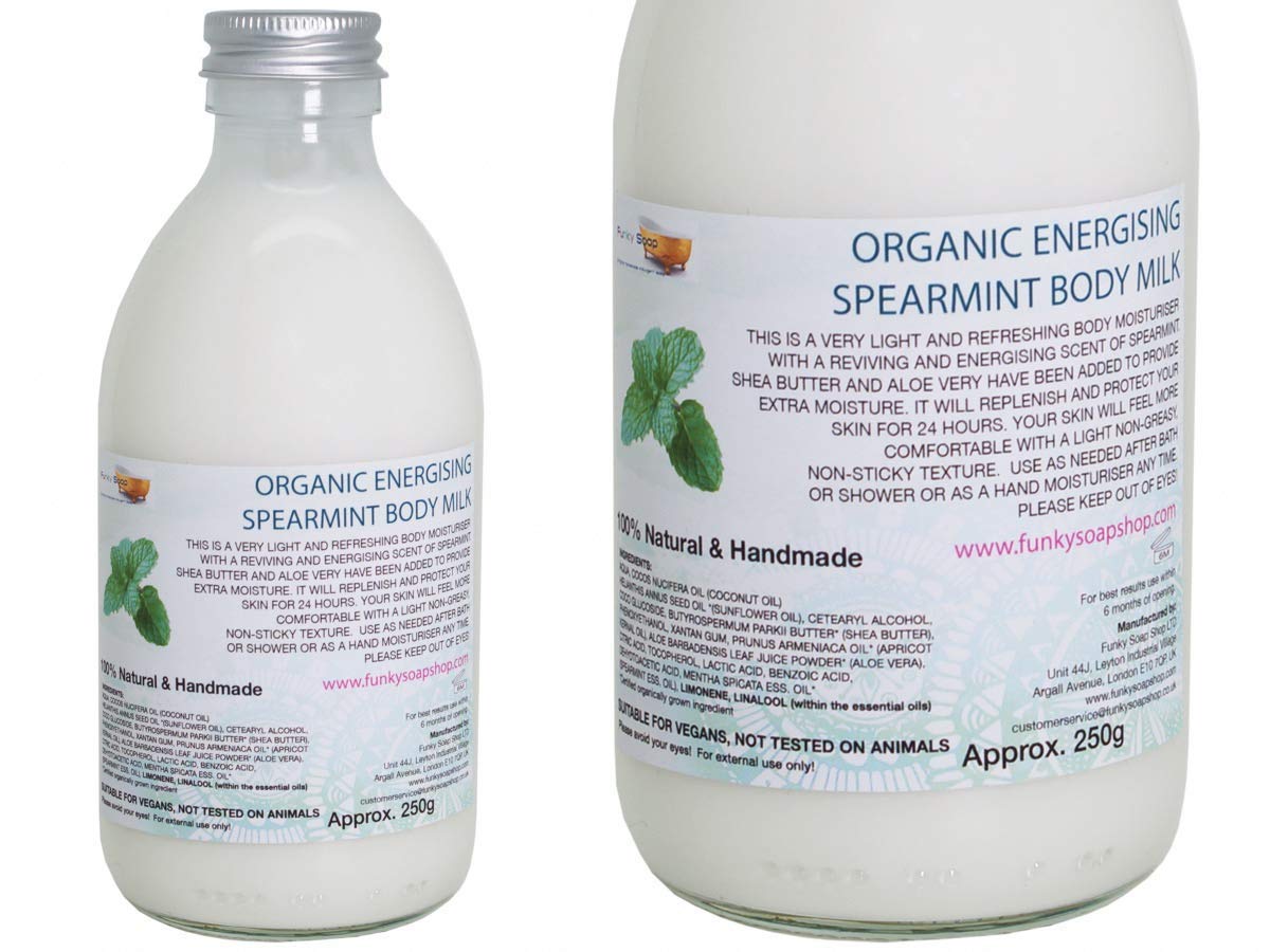This is a very light and refreshing body moisture care with an invigorating and invigorating fragrance of green mint.Shea butter and Vera were added to donate additional moisture.It will fill up and protect your skin for 24 hours.Your skin will feel more comfortable with a light, non -fatty, non -sticky texture.Use them after bathing/showering or as a hand moisture cream at any time.Please keep outside of the eyes!It presents itself in a stylish 250 ml of glass with an aluminum lid, a plastic -free alternative.Ingredients: Aqua, Cocos Nucifera Oil (coconut oil), Helianthis Annus Seed Oil* (sunflower oil), Cetearyl Alcohol, Coco Glucoside, Butyrospermum Parkii Butter* (shea butter), phenoxyethanol, Xantan Gum, Prunus Armeniaca Oil*)Barbadensis Leaf Juice Powder Loe Vera), citric acid, tocopherol, lactic acid, benzoic acid, dehydtoine acid, mentha spicata ESS.Oil* (Spearmint eating oil), lime, linalool (in the essential oils).Certified biological ingredients.Do not contain animal products, suitable for vegans, not tested on animals.Our products are all 100% natural and handmade in small batches.Form, color, fragrance, size and appearance can vary slightly between batches and it is in the nature of this product.Since it is natural scents, they may not be that strong or develop in use.Our products are all handmade in London with 100 % natural ingredients.Suitable for vegans, free of animal experiments, artificial fragrance and color -free, paraben -free.Ingredients: Aqua, Cocos Nucifera Oil (coconut oil), Helianthis Annus Seed Oil* (sunflower oil), Cetearyl Alcohol, Coco Glucoside, Butyrospermum Parkii Butter* (shea butter), phenoxyethanol, Xantan Gum, Prunus Armeniaca Oil*)Barbadensis Leaf Juice Powder Loe Vera), citric acid, tocopherol, lactic acid, benzoic acid, dehydtoine acid, mentha spicata ESS.Oil* (Spearmint Ess. Oil), Limonene, Linalool (within the essential oils).Fill moisture and restore it for all skin types.Plastic -free alternative in a glass bottle.Organic body milk with green mint. Dies ist eine sehr leichte und erfrischende Körperfeuchtigkeitspflege mit einem belebenden und belebenden Duft von grüner Minze. Sheabutter und Vera wurden hinzugefügt, um zusätzliche Feuchtigkeit zu spenden. Es wird Ihre Haut für 24 Stunden auffüllen und schützen. Ihre Haut wird sich wohler anfühlen mit einer leichten, nicht fettenden, nicht klebrigen Textur. Verwenden Sie sie nach dem Baden/Duschen oder als Hand-Feuchtigkeitscreme jederzeit. Bitte außerhalb der Augen halten! Es präsentiert sich in einem stilvollen 250 ml Glas mit einem Aluminiumdeckel, eine plastikfreie Alternative. Inhaltsstoffe: Aqua, Cocos Nucifera Oil (Kokosöl), Helianthis Annus Seed Oil *(Sonnenblumenöl), Cetearyl Alcohol, Coco Glucoside, Butyrospermum Parkii Butter* (Sheabutter), Phenoxyethanol, Xantan Gum, Prunus Armeniaca Oil* (Apricot Kernal Oil), Aloe Barbadensis Leaf Juice Powder Loe Vera), Zitronensäure, Tocopherol, Milchsäure, Benzoesäure, Dehydtoessigsäure, Mentha Spicata Ess. Öl* (Spearmint Ess. Öl), Limonen, Linalool (in den ätherischen Ölen). Zertifizierte biologische Zutaten. Enthält keine tierischen Produkte, geeignet für Veganer, nicht an Tieren getestet. Unsere Produkte sind alle 100% natürlich und in kleinen Chargen handgefertigt. Form, Farbe, Duft, Größe und Aussehen können zwischen Chargen leicht variieren und es liegt in der Natur dieses Produkts. Da es sich um natürliche Düfte handelt, sind sie vielleicht nicht so stark oder entwickeln sich bei der Verwendung.Unsere Produkte werden alle handgefertigt in London mit 100 % natürlichen Zutaten. Geeignet für Veganer, tierversuchsfrei, künstlicher Duft und farbfrei, parabenfrei. Inhaltsstoffe: Aqua, Cocos Nucifera Oil (Kokosöl), Helianthis Annus Seed Oil *(Sonnenblumenöl), Cetearyl Alcohol, Coco Glucoside, Butyrospermum Parkii Butter* (Sheabutter), Phenoxyethanol, Xantan Gum, Prunus Armeniaca Oil* (Apricot Kernal Oil), Aloe Barbadensis Leaf Juice Powder Loe Vera), Zitronensäure, Tocopherol, Milchsäure, Benzoesäure, Dehydtoessigsäure, Mentha Spicata Ess. Öl* (Spearmint Ess. Öl), Limonene, Linalool (Innerhalb der ätherischen Öle). Füllt Feuchtigkeit auf und stellt sie wieder her, für alle Hauttypen. Kunststofffreie Alternative in einer Glasflasche. Organische Körpermilch mit grüner Minze.Funky Soap Bio-Körpermilch, energetisierend, grüne Minze, plastikfrei, Glasflasche, 250 ml