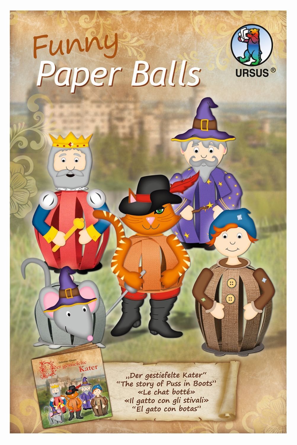 Funny Paper Balls - The funny paper figures by Ursus in various fairy tale topics arouse the desire to make wonderful funny paper balls from several paper strips.The handicraft set in the design ""The Cutting Cat"" contains materials for 5 Funny Paper Balls (diameter 6 - 7 cm).The pack contains 25 punched paper strips in 5 different colors.In addition to the paper strips, you will receive 5 wires, various stamped parts, 57 wooden beads and the fairy tale book ""The Puss in Broot"" from the Grimm brothers.The enclosed instructions show how a formed ball is formed from the paper strips in the form of an animal.